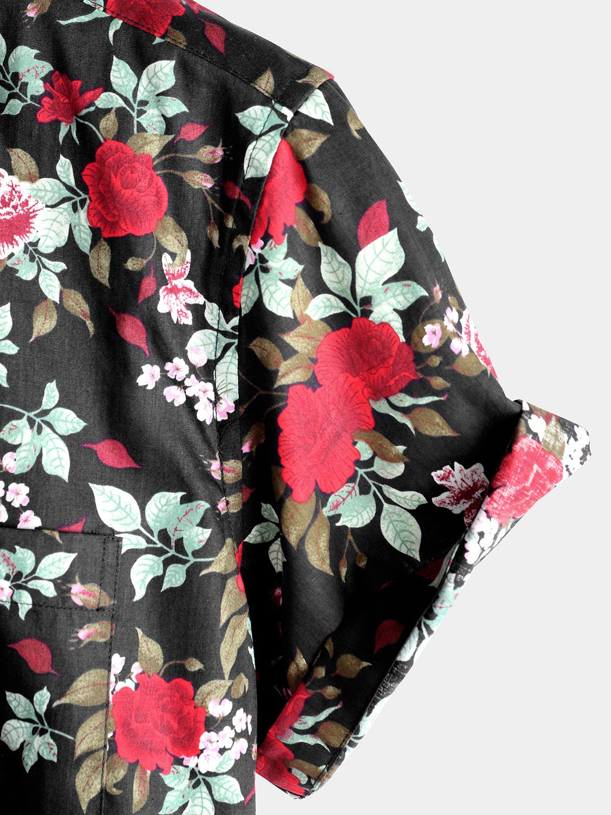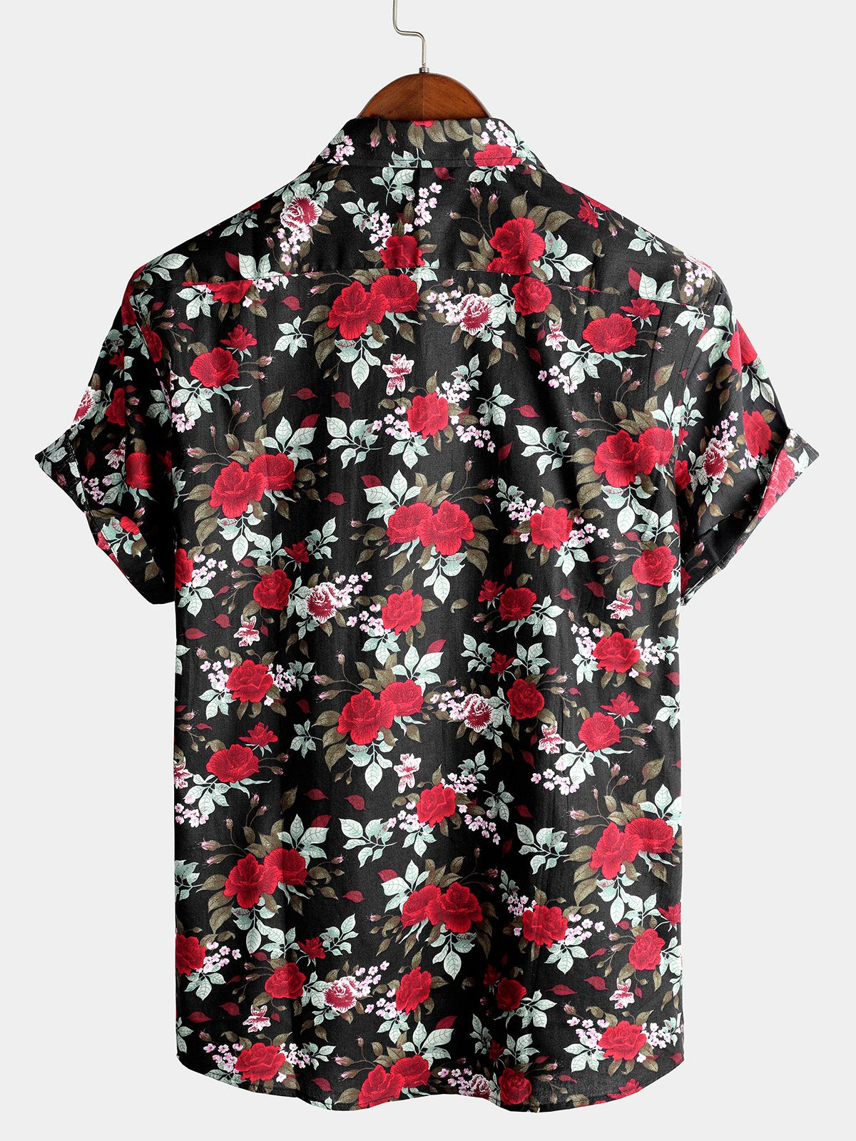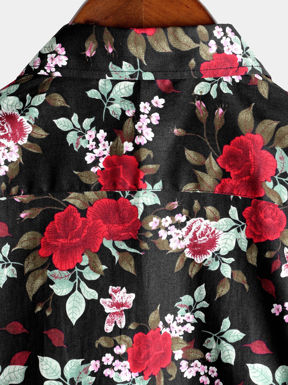 Men's Black Floral Holiday Rose Print Cotton Short Sleeve Shirt