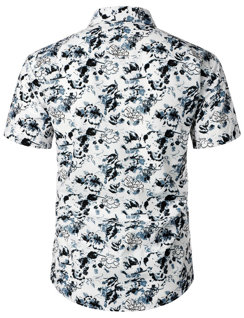 Men's White and Black Floral Summer Flower Button Up Cotton Short Sleeve Shirt