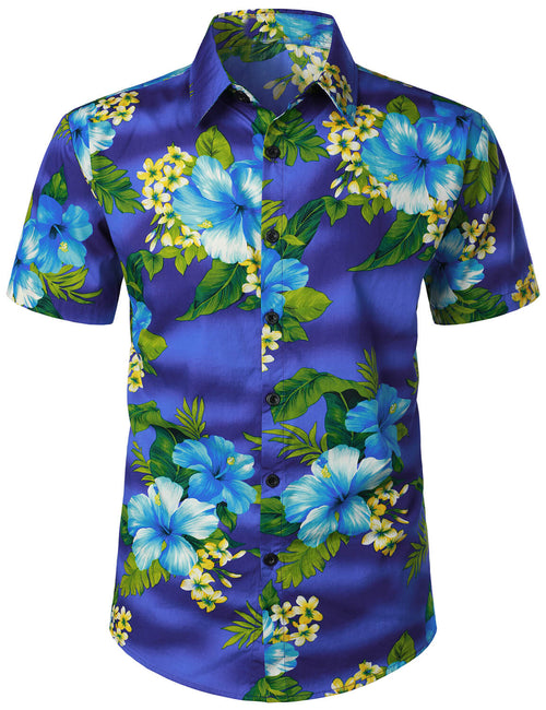 Men's Hawaiian Tropical Button Hibiscus Floral Print Vacation Beach Blue Short Sleeve Shirt