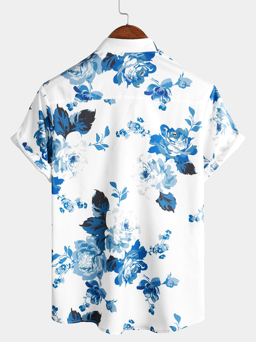 Men's Floral Print Vacation Casual Blue Flower Cotton Short Sleeve Shirt