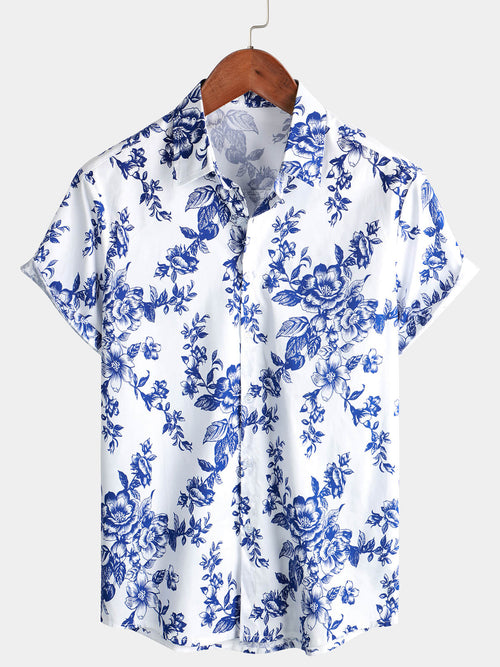 Men's Cotton Blue Floral Holiday Short Sleeve Shirt