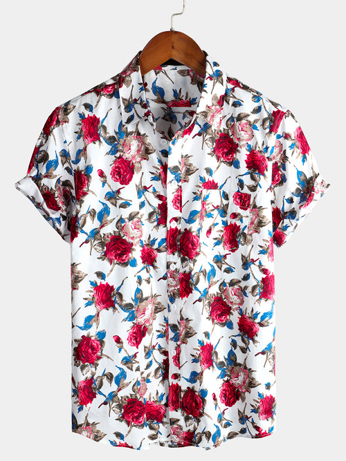 Men's Retro Flower Print Floral Button Up Vintage Holiday Short Sleeve Shirt