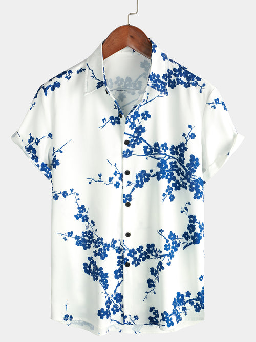 Men's Floral Print Vacation Casual Blue Flower Cotton Short Sleeve Shirt