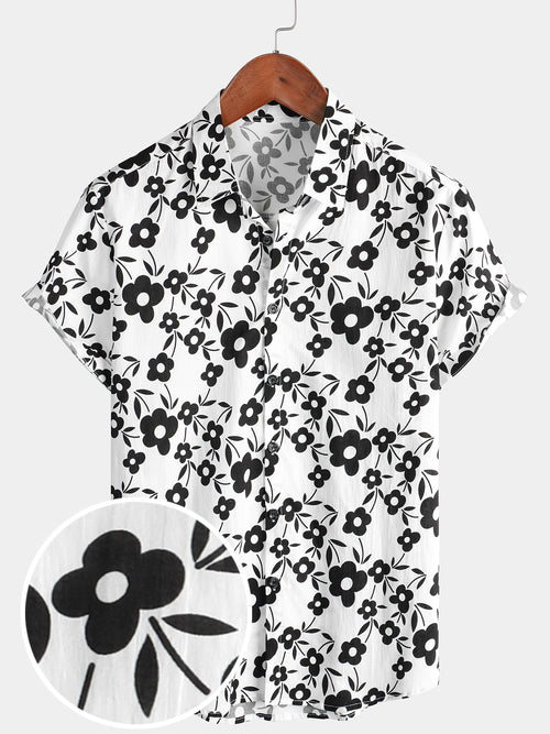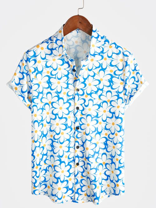 Men's Floral Daisy Print Hawaiian Cotton Button Up Summer Short Sleeve Flower Shirt