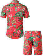 Men's Red Flower Tropical Hawaiian Matching Shirt and Shorts Set