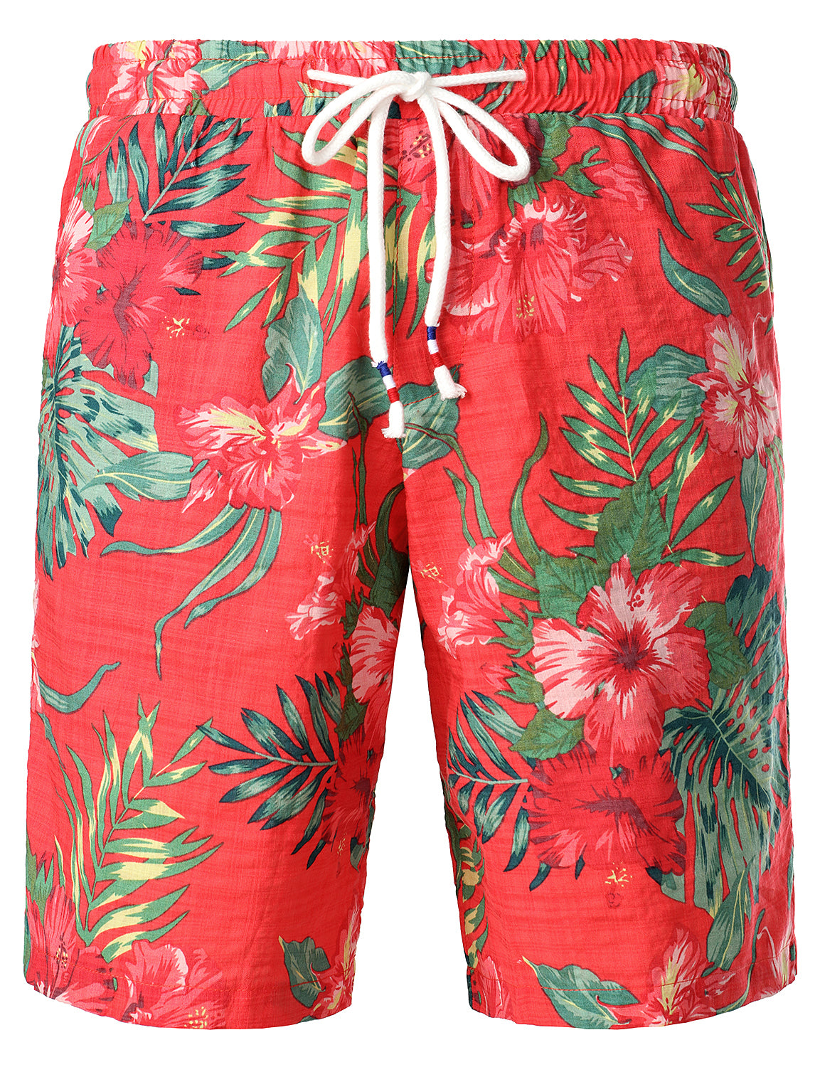 - About Shorts: flat-front casual all-over printing shorts with slanted side pockets and rear pockets, mid-rise, elastic waist, and drawstring