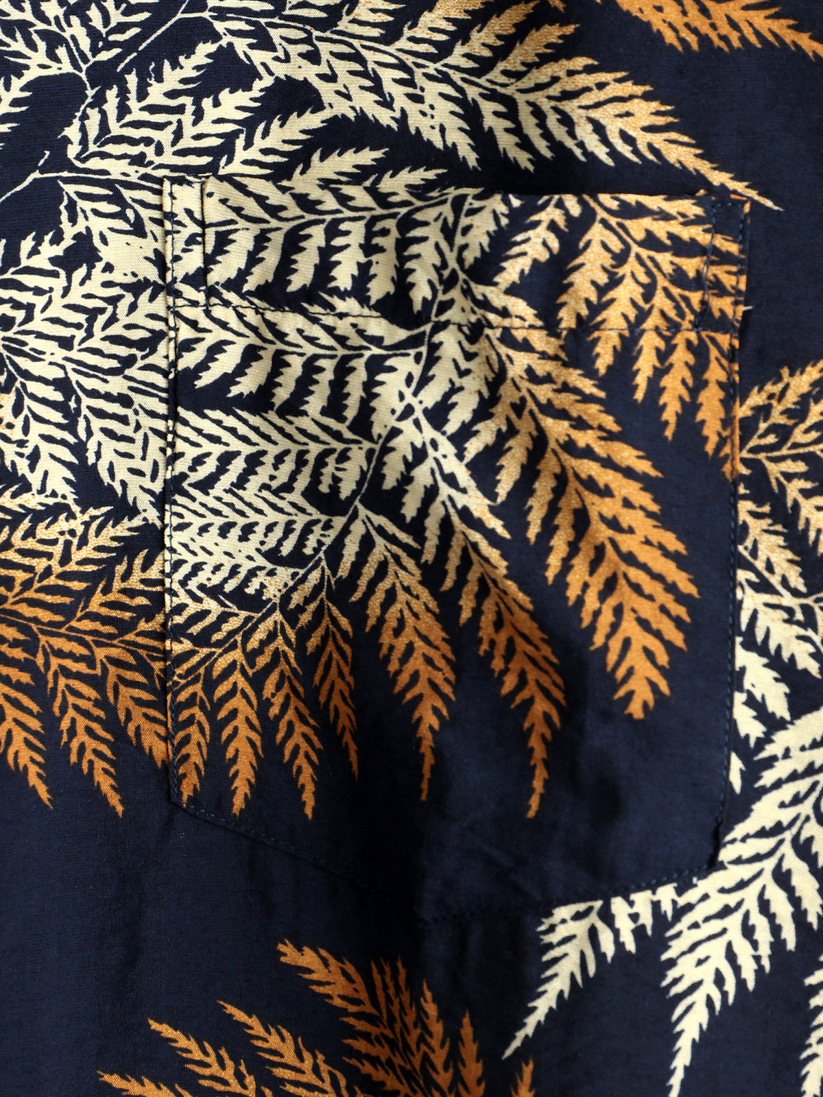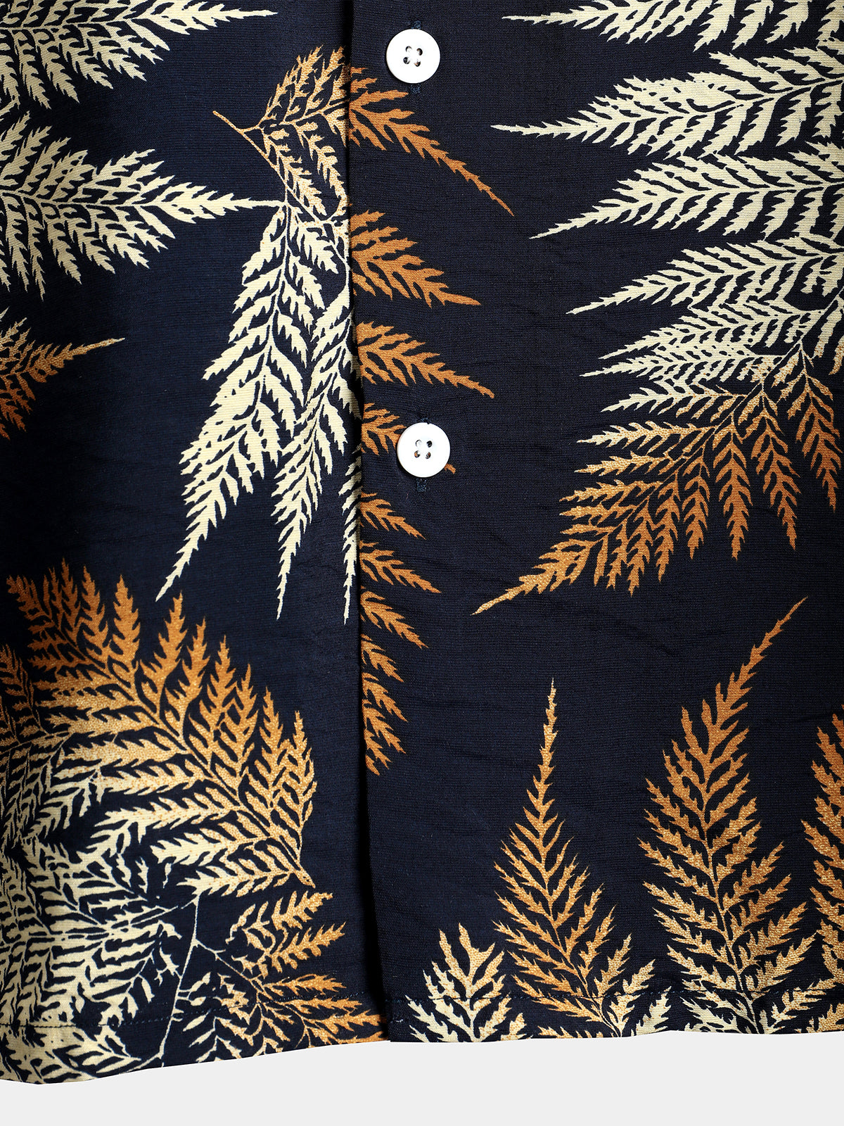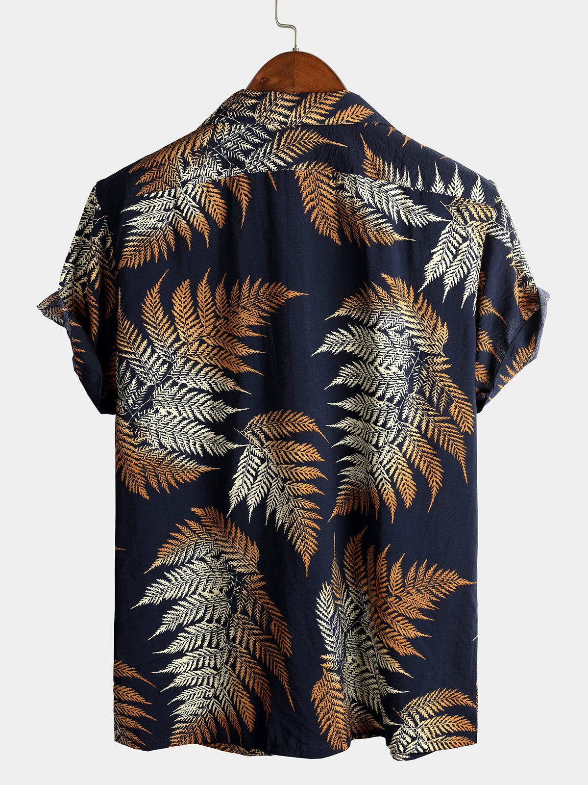 Men's Navy Blue Tropical Leaf Print Pocket Hawaiian Short Sleeve Shirt