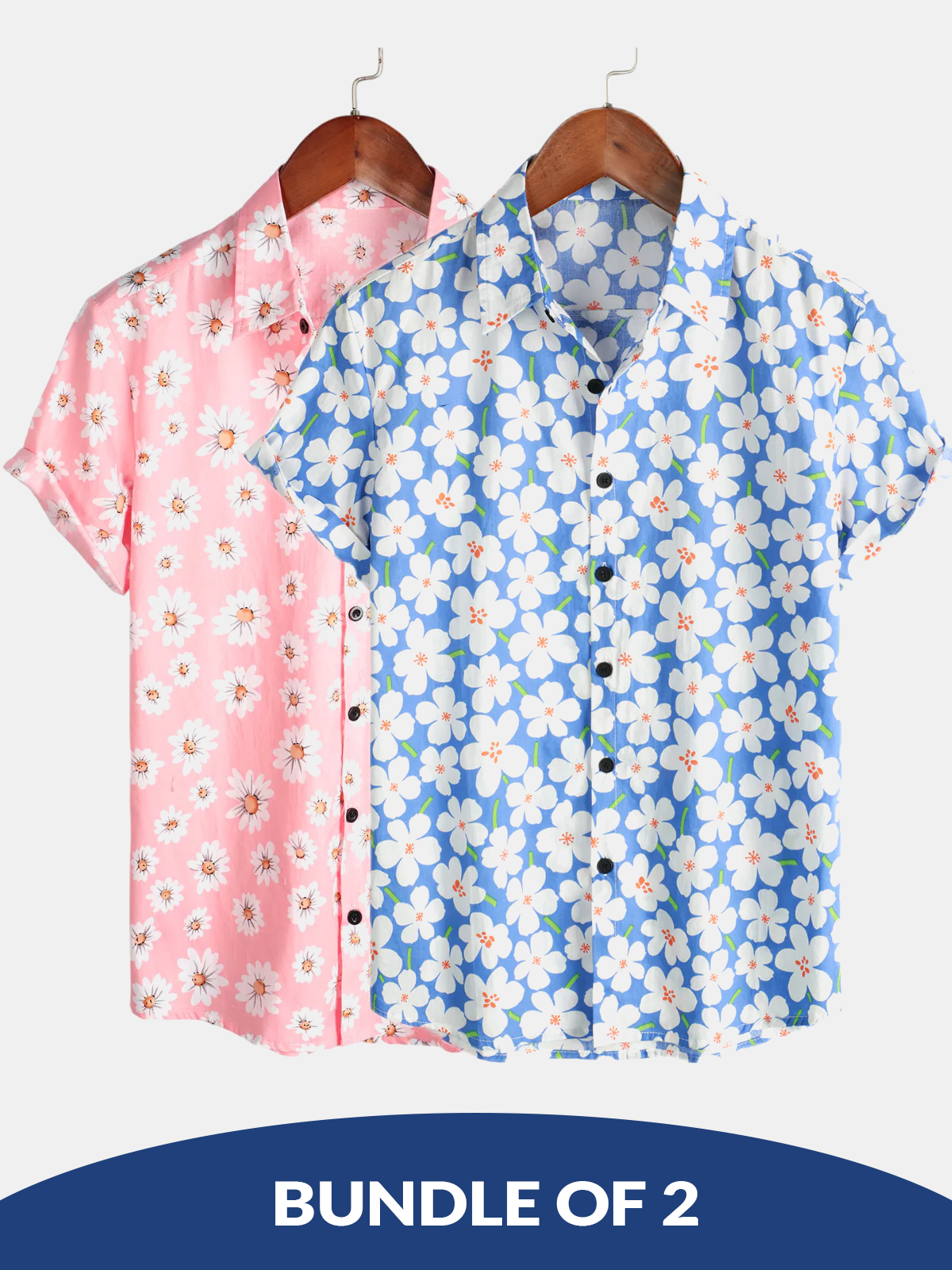 Bundle Of 2 | Men's Pink & Blue Floral Print Tropical Hawaii Cotton Shirt