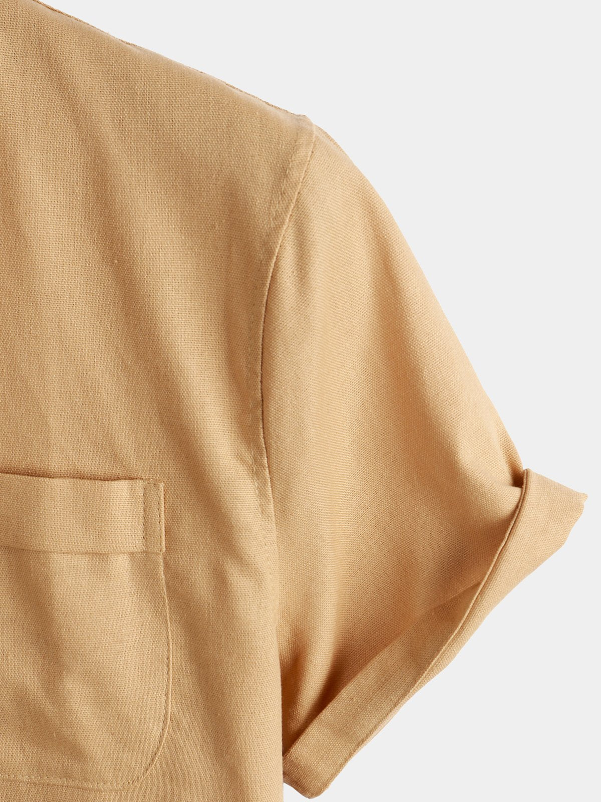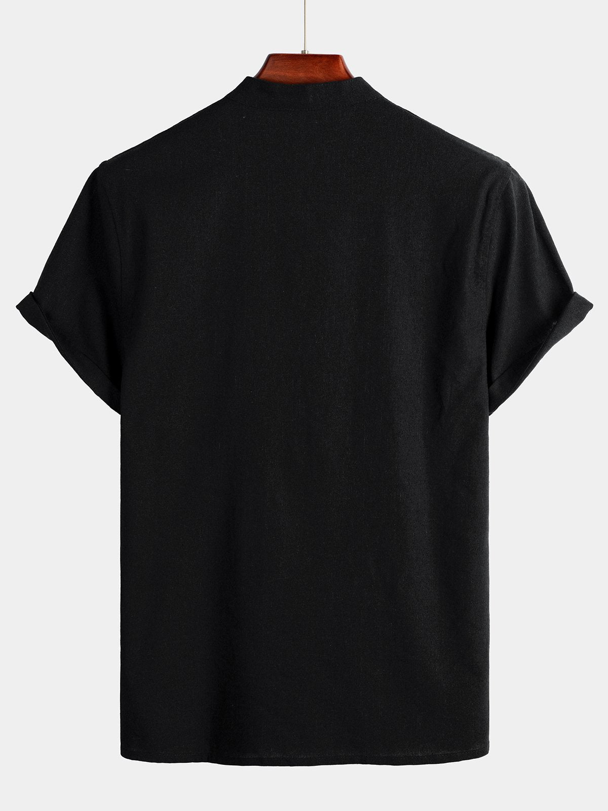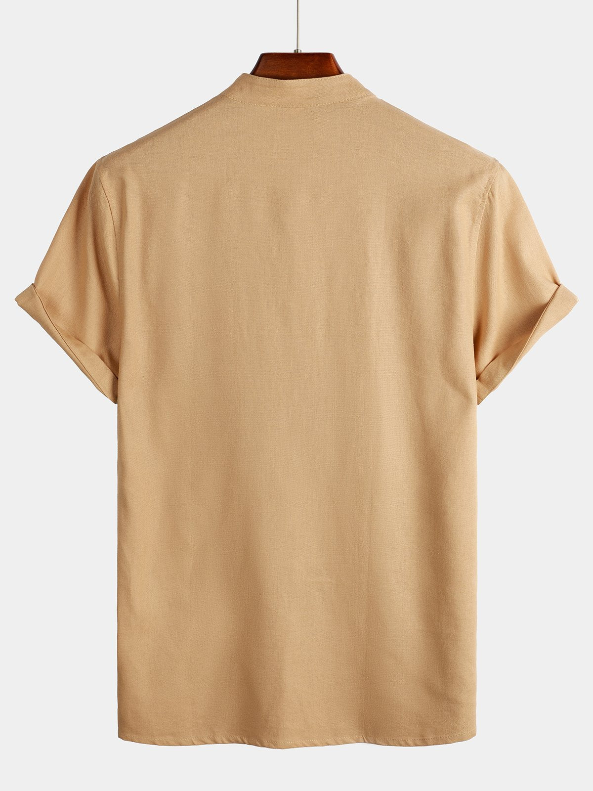 - Button-front shirt featuring stand collar and short sleeve.
