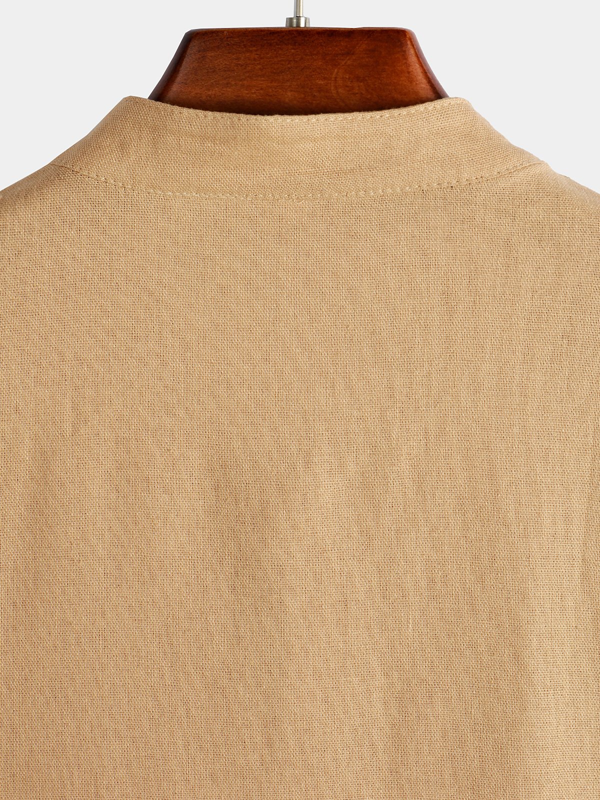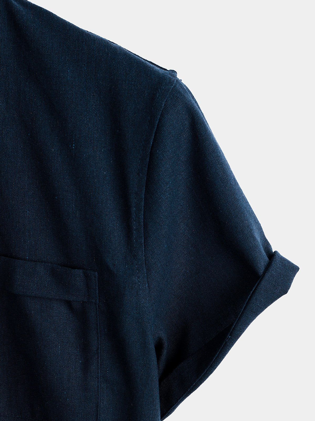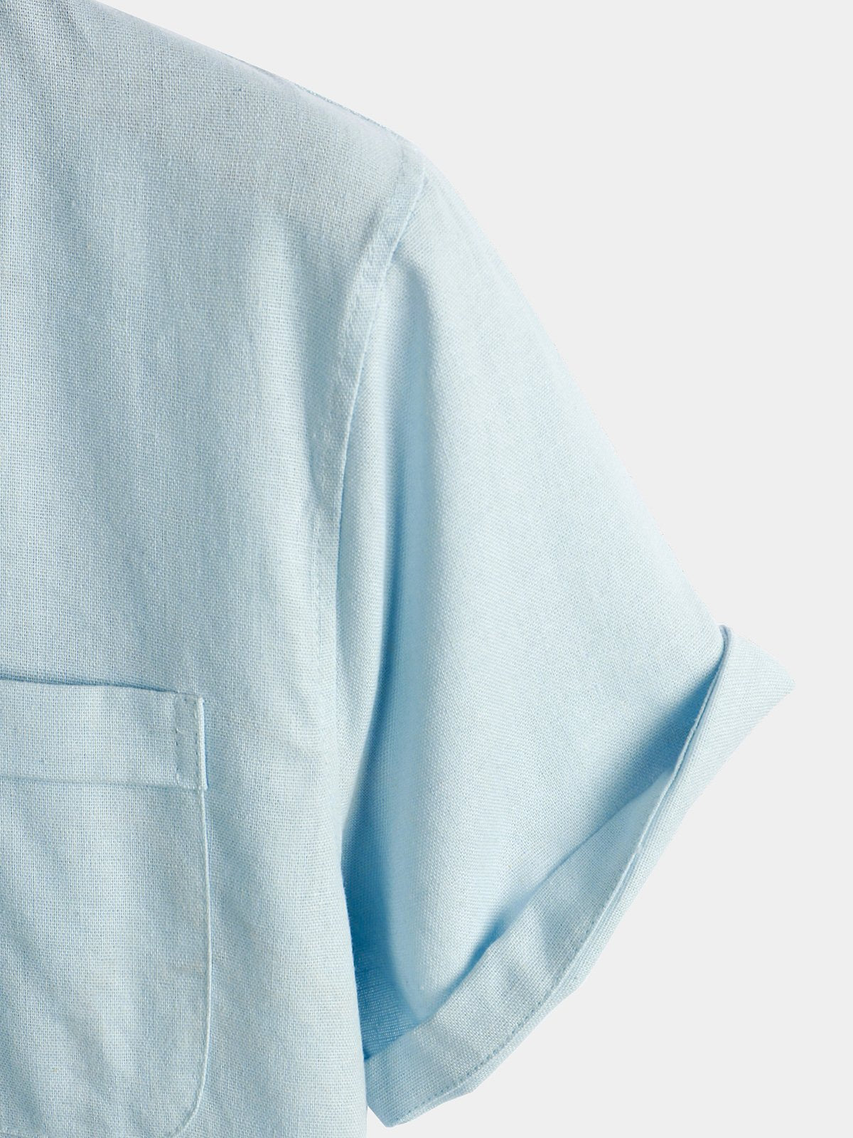 - Button-front shirt featuring stand collar and short sleeve.