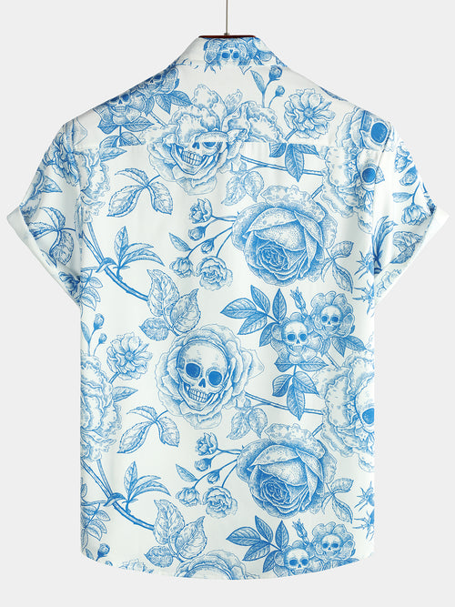 Men's Pirate Skull Costume Art Dark Blue Caribbean Cruise Themed Party Halloween Short Sleeve Shirt