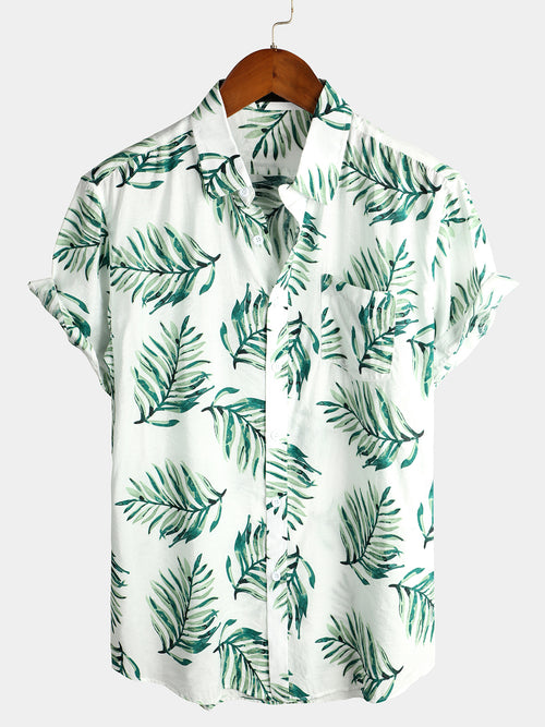 Men's Green Tropical Plant Leaf Geometric Print Vacation Short Sleeve Hawaiian Shirt