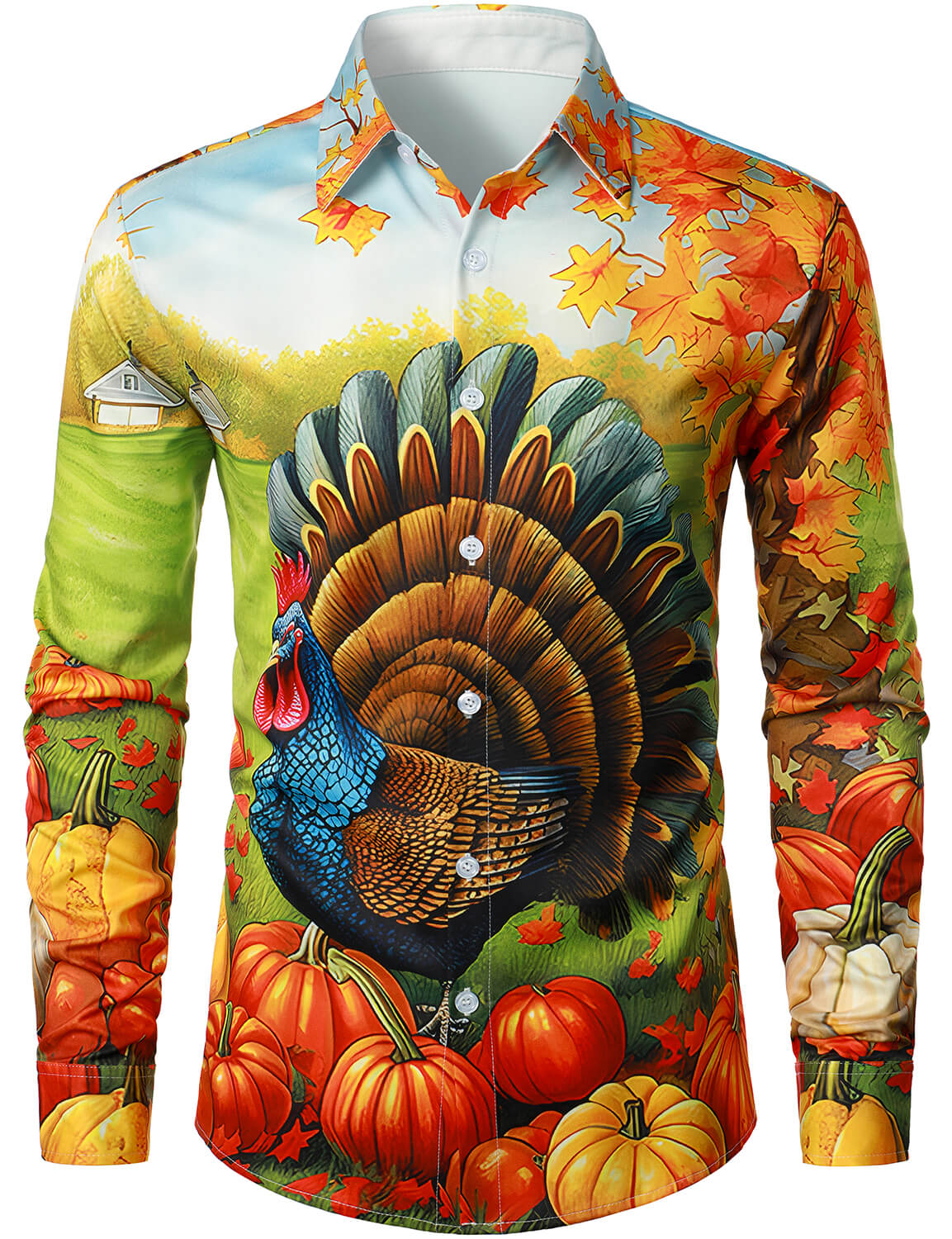 Men's Cute Turkey Thanksgiving Fall Festival Gift Pumpkin Holiday Button Ugly Long Sleeve Shirt
