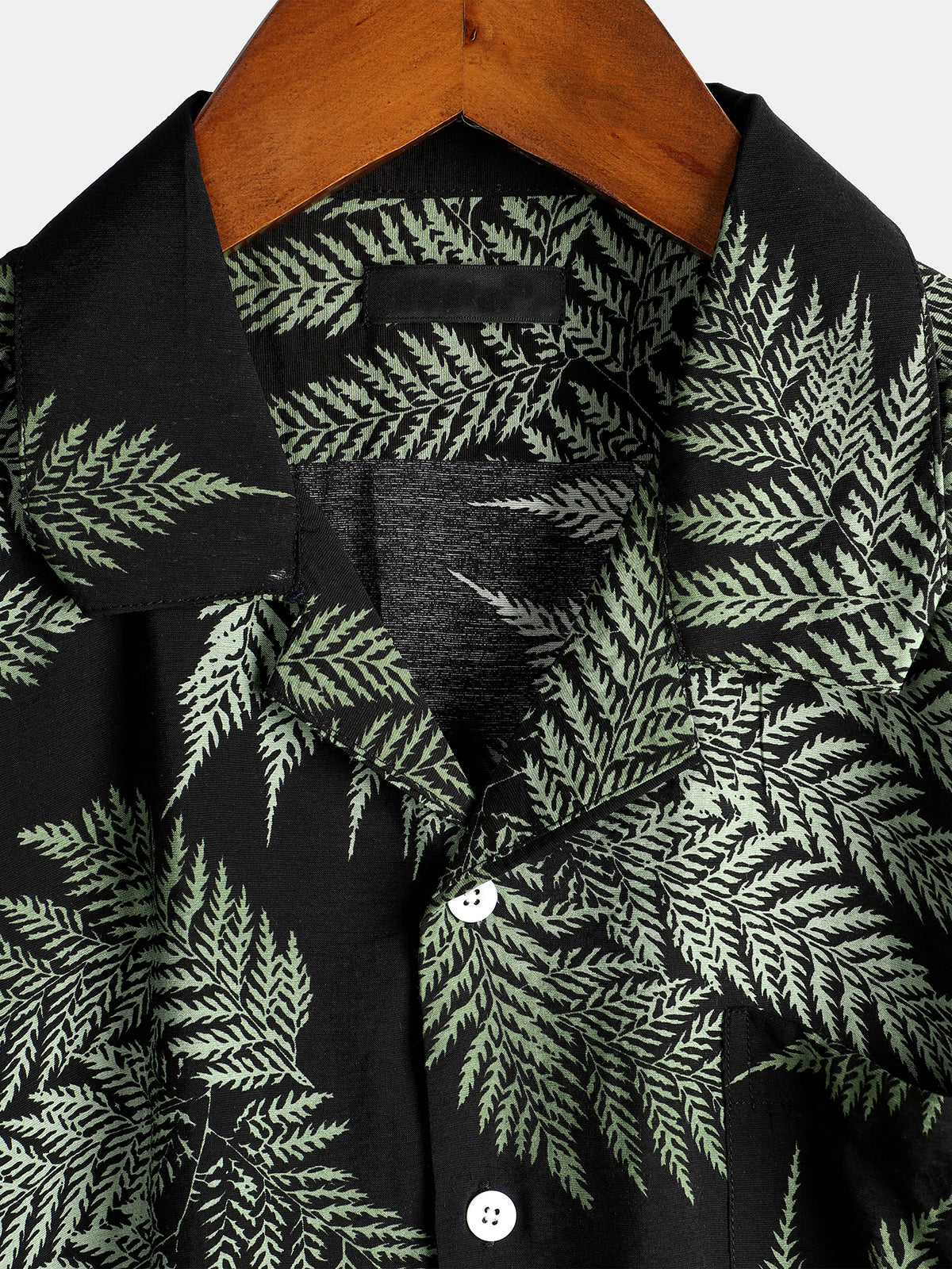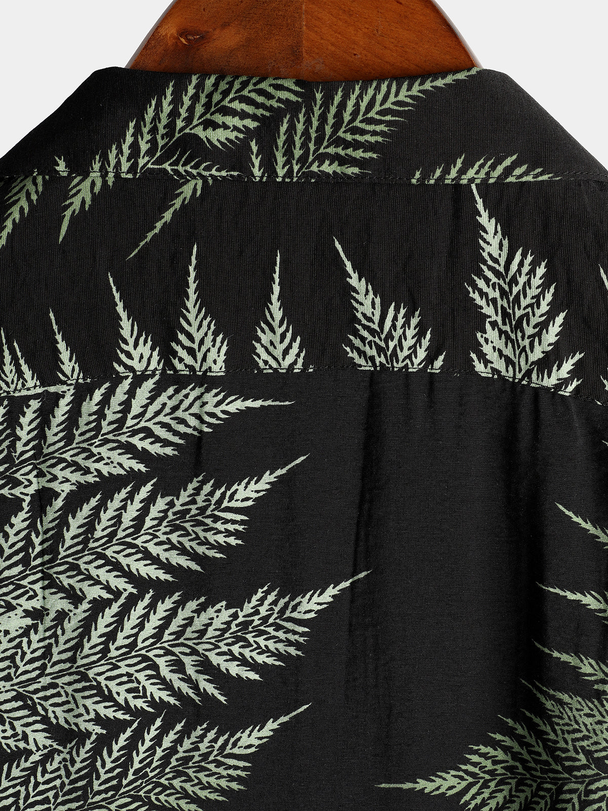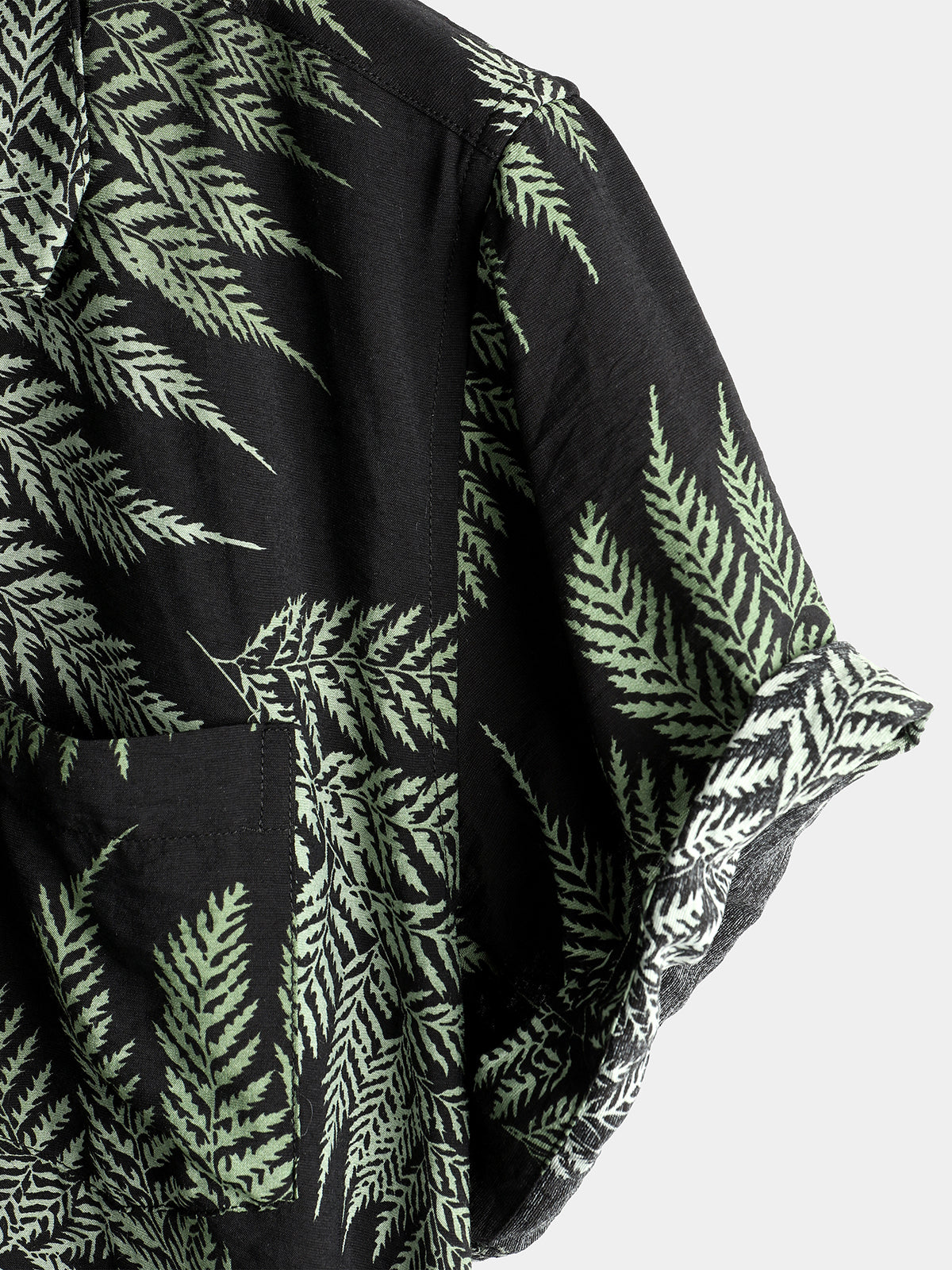 Men's Black Tropical Leaves Print Pocket Hawaiian Short Sleeve Shirt