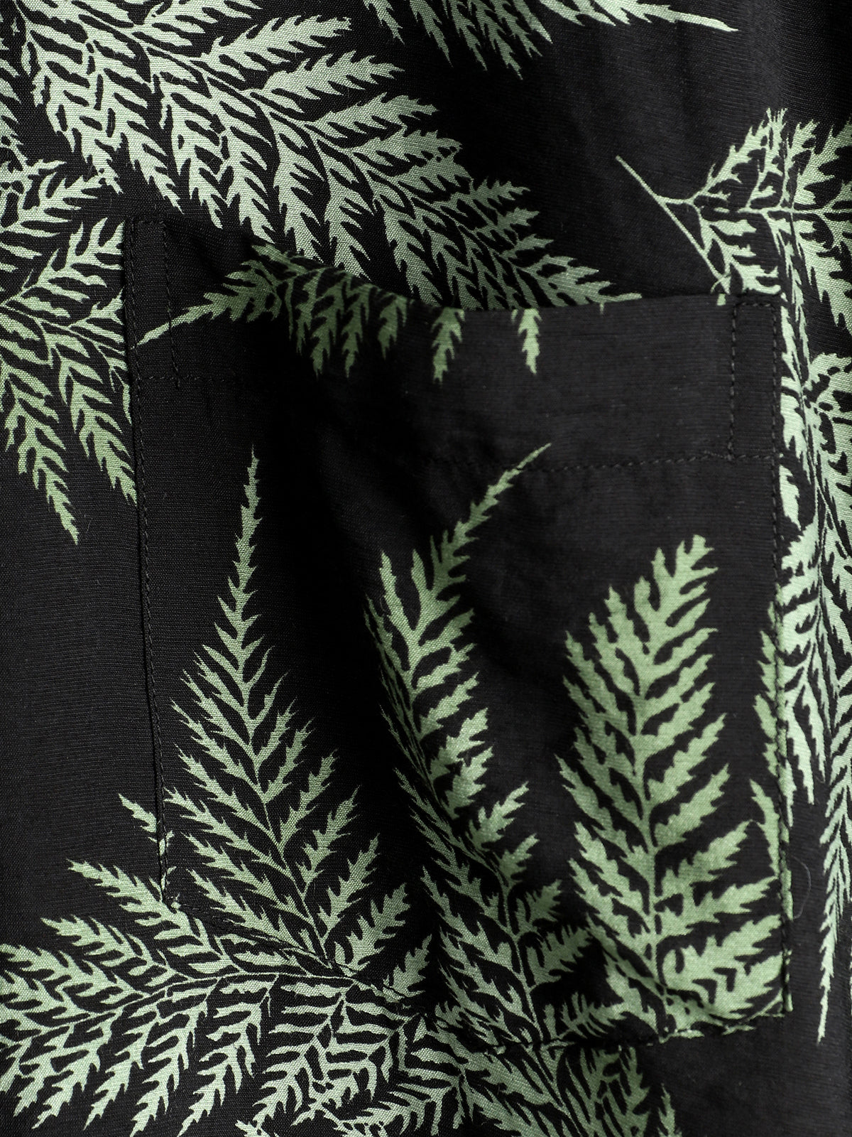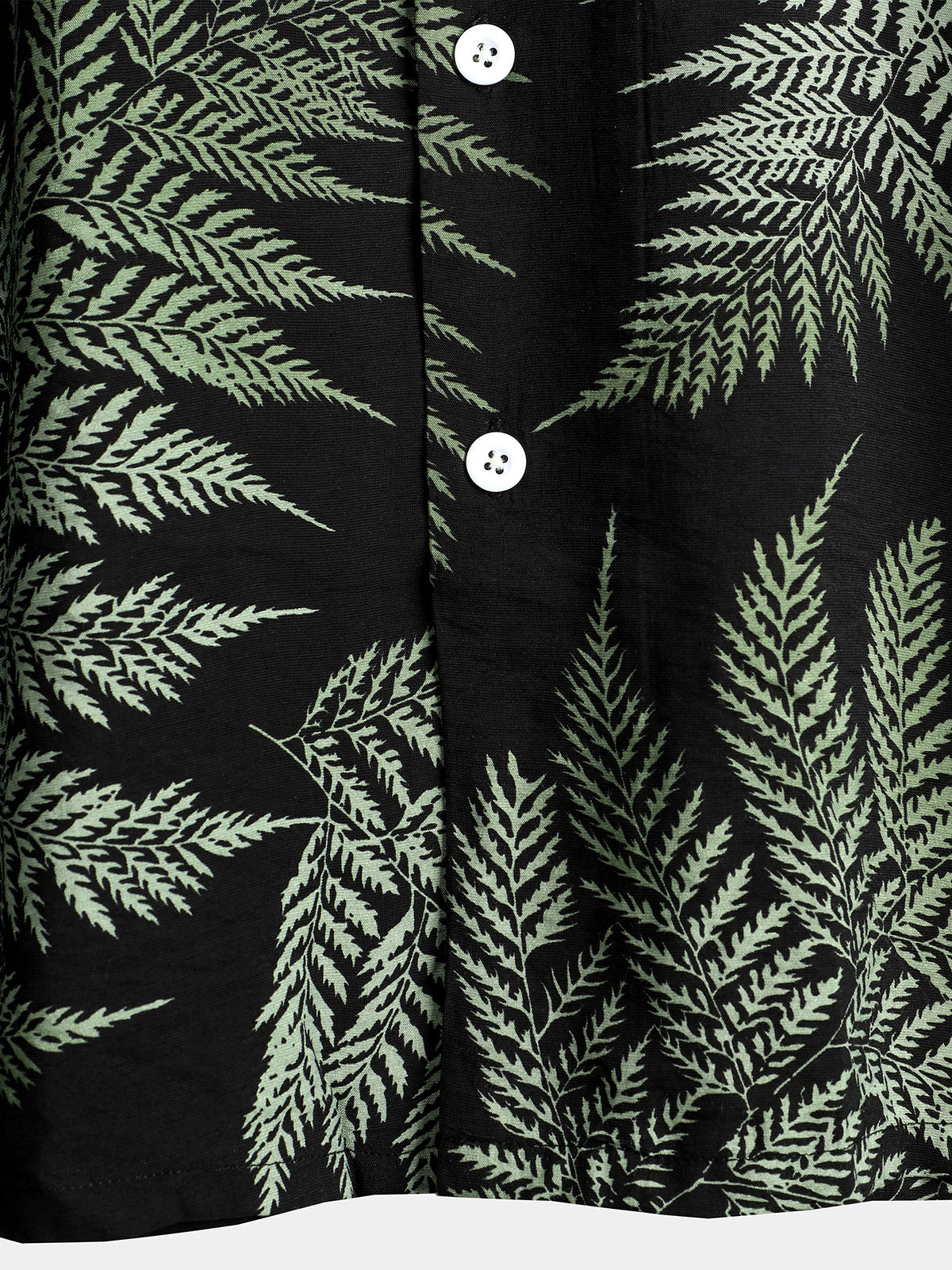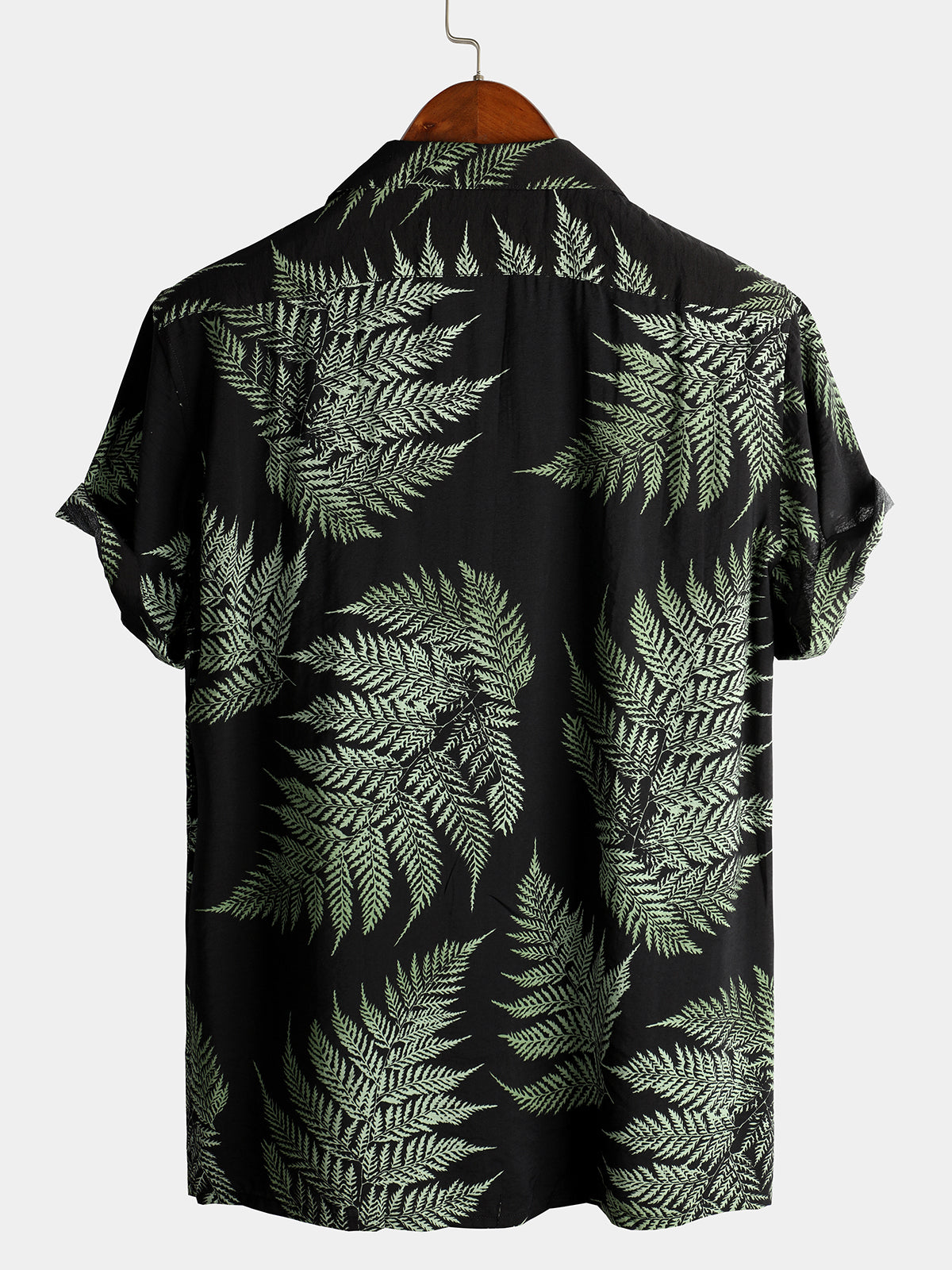 Men's Black Tropical Leaves Print Pocket Hawaiian Short Sleeve Shirt
