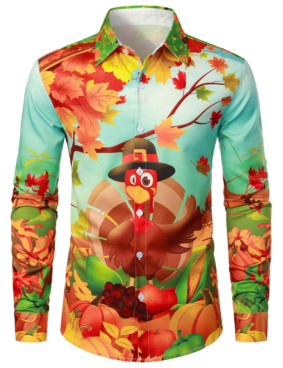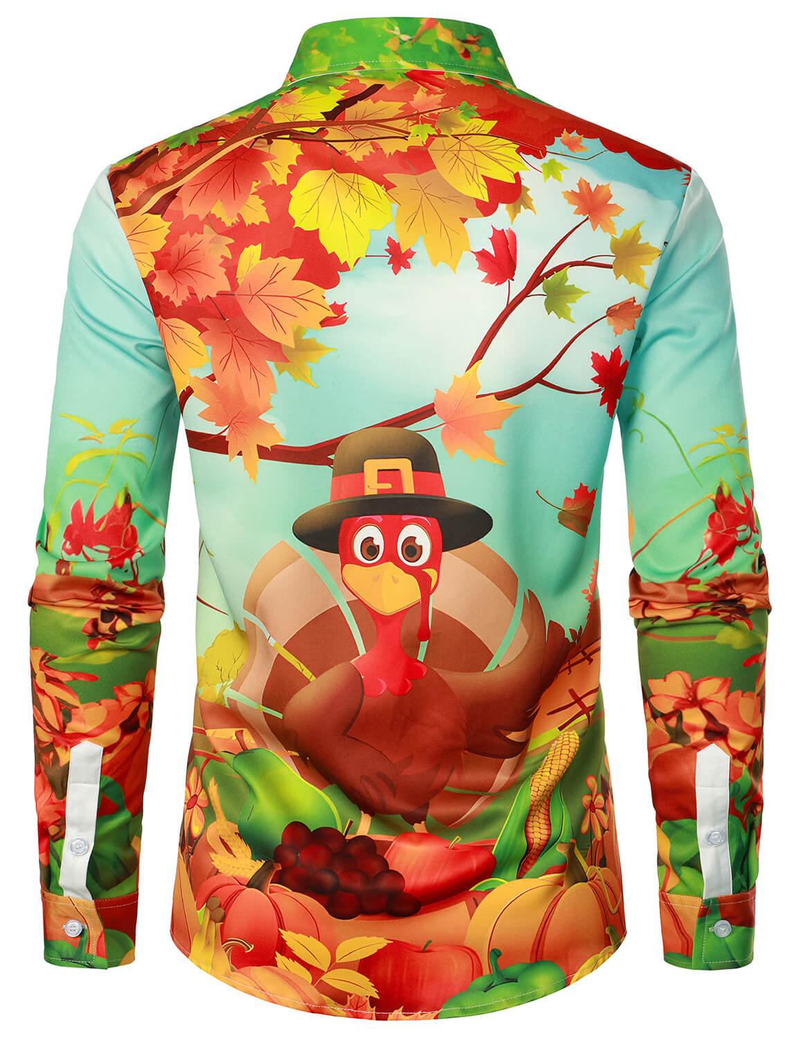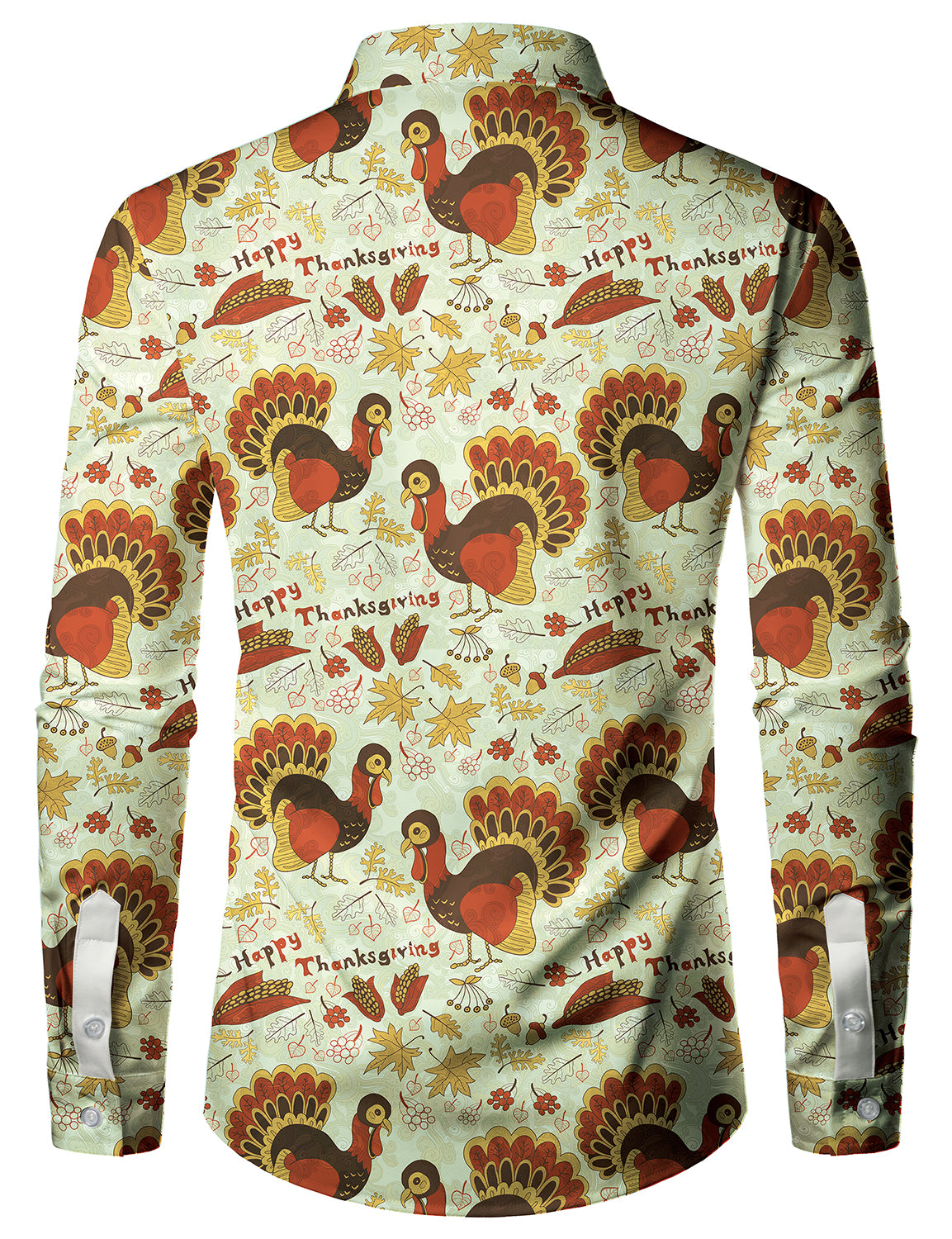 Men's Turkey Thanksgiving Fall Festival Cute Cartoon Holiday Button Up Long Sleeve Shirt