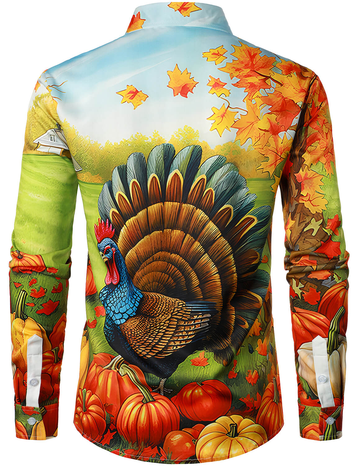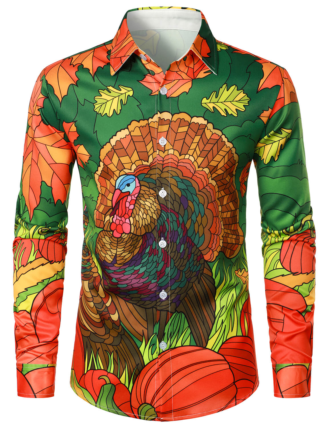 Men's Casual Holiday Thanksgiving Cartoon Turkey Pumpkin Long Sleeve Shirt