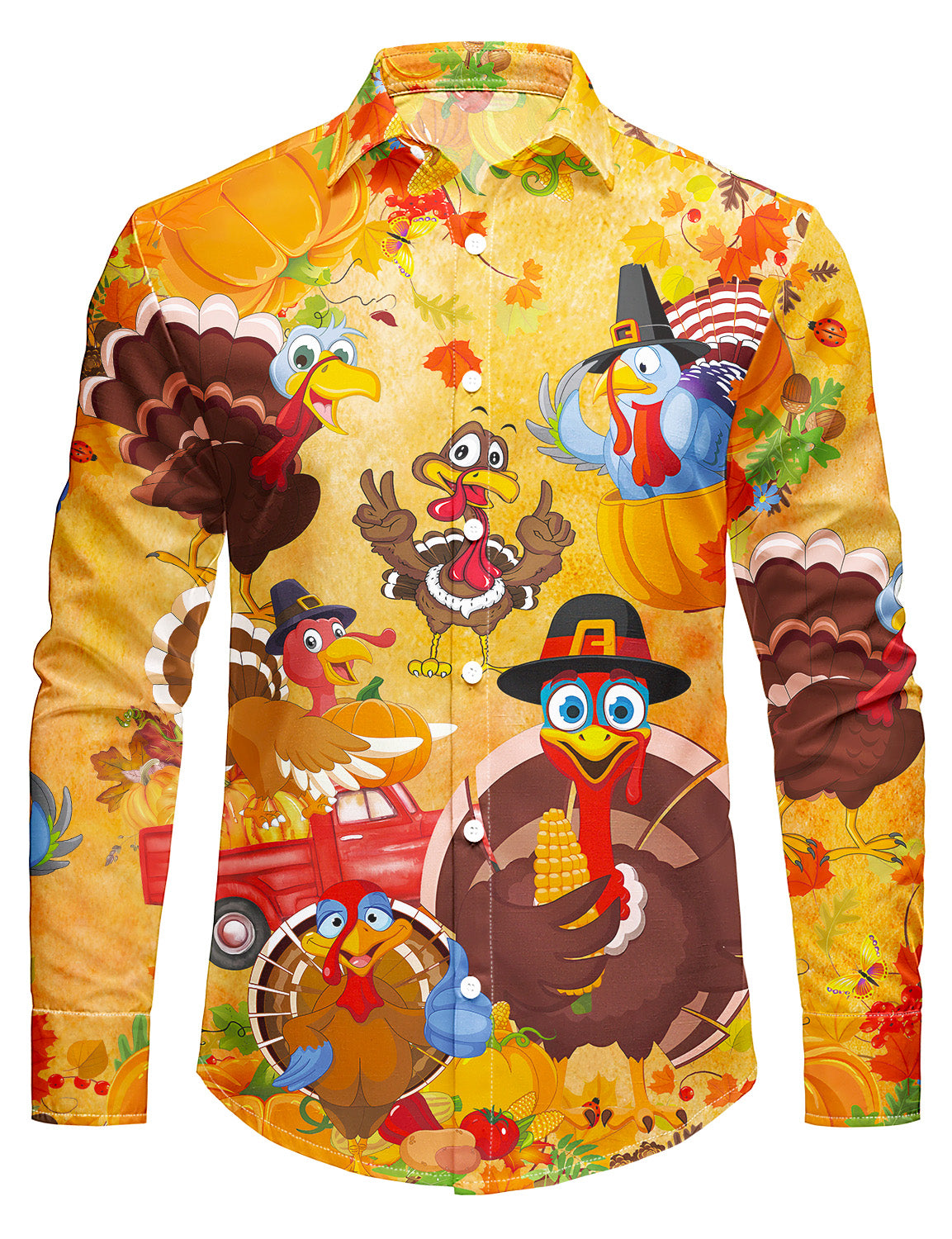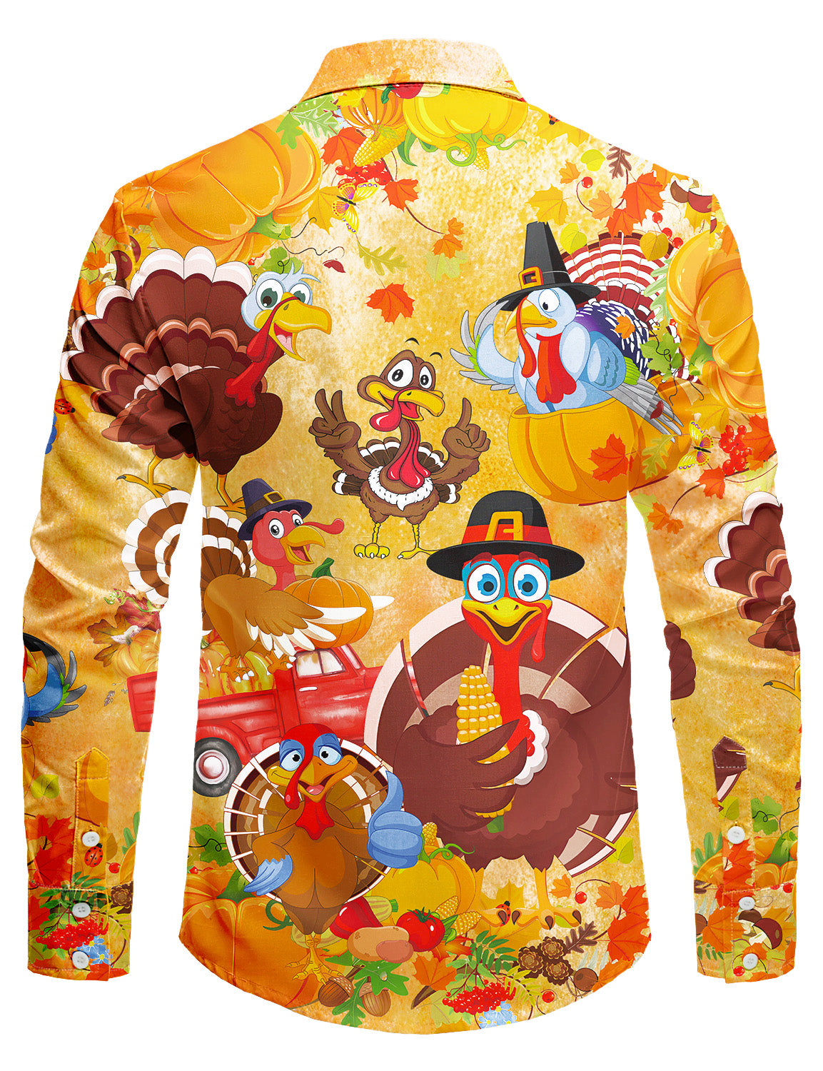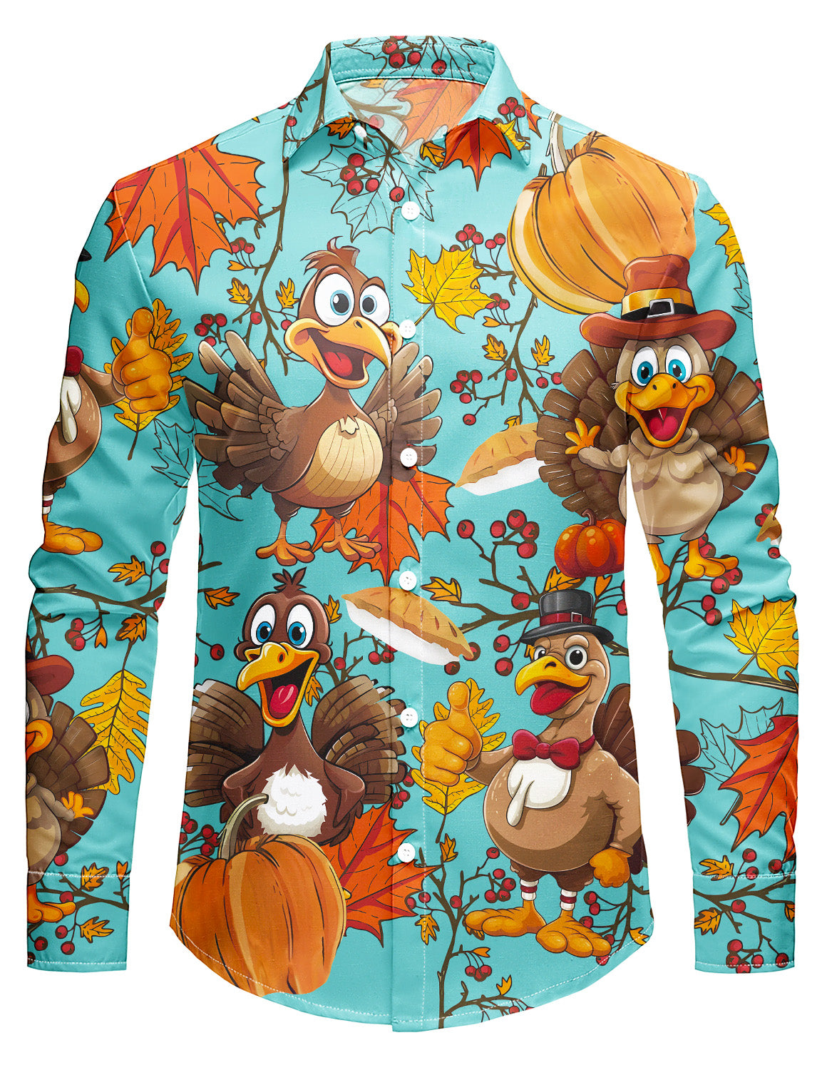 Men's Thanksgiving Cartoon Turkey Pumpkin Holiday Button Long Sleeve Shirt