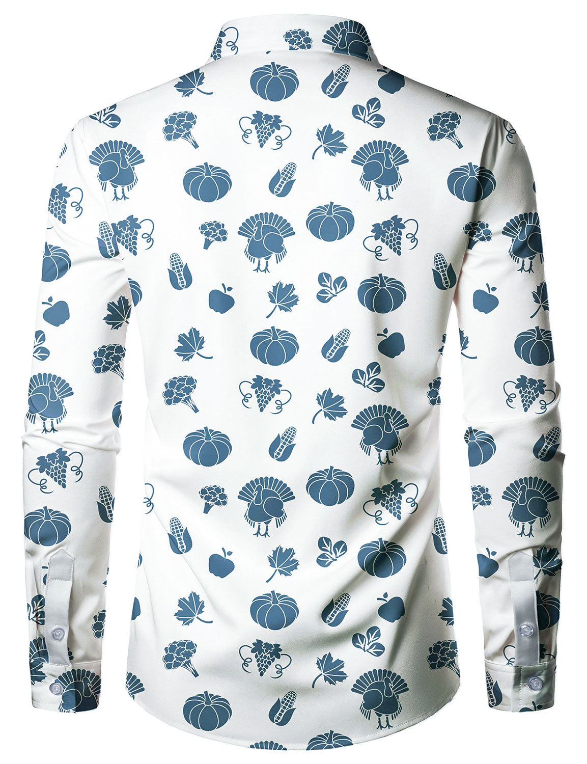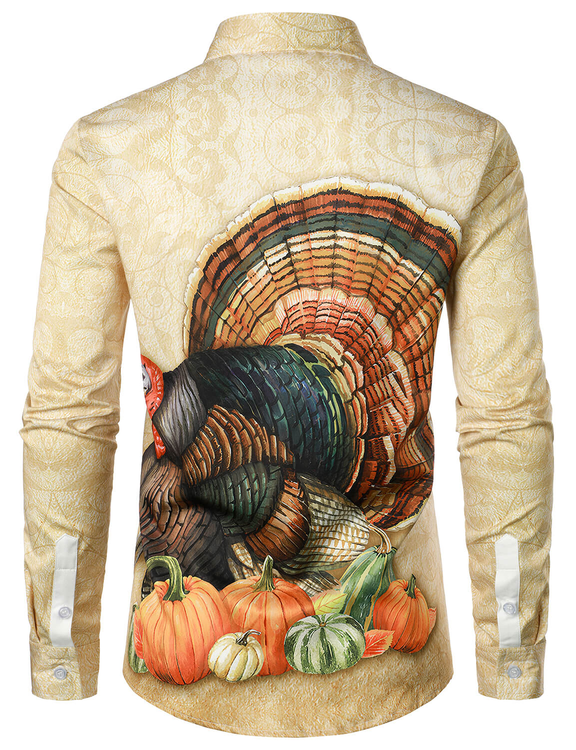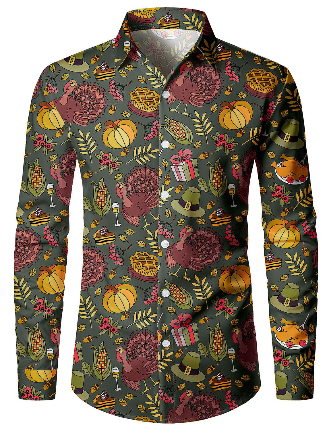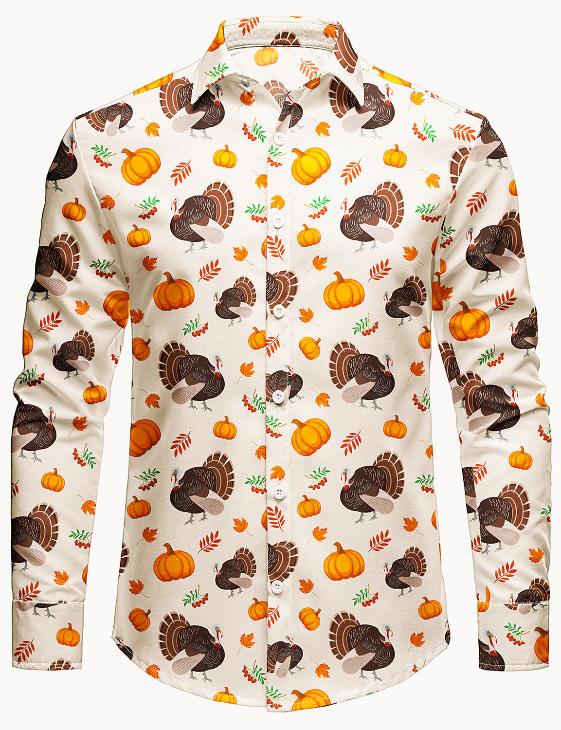 Men's Thanksgiving Cartoon Turkey Pumpkin Holiday Button Long Sleeve Shirt