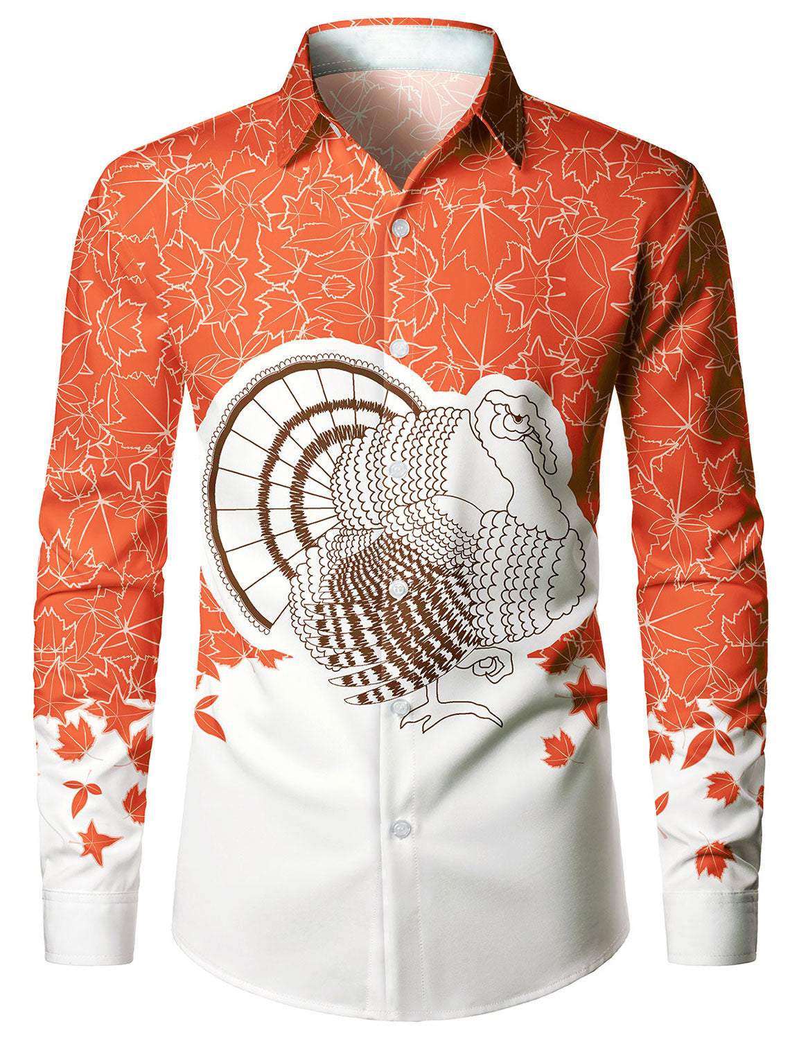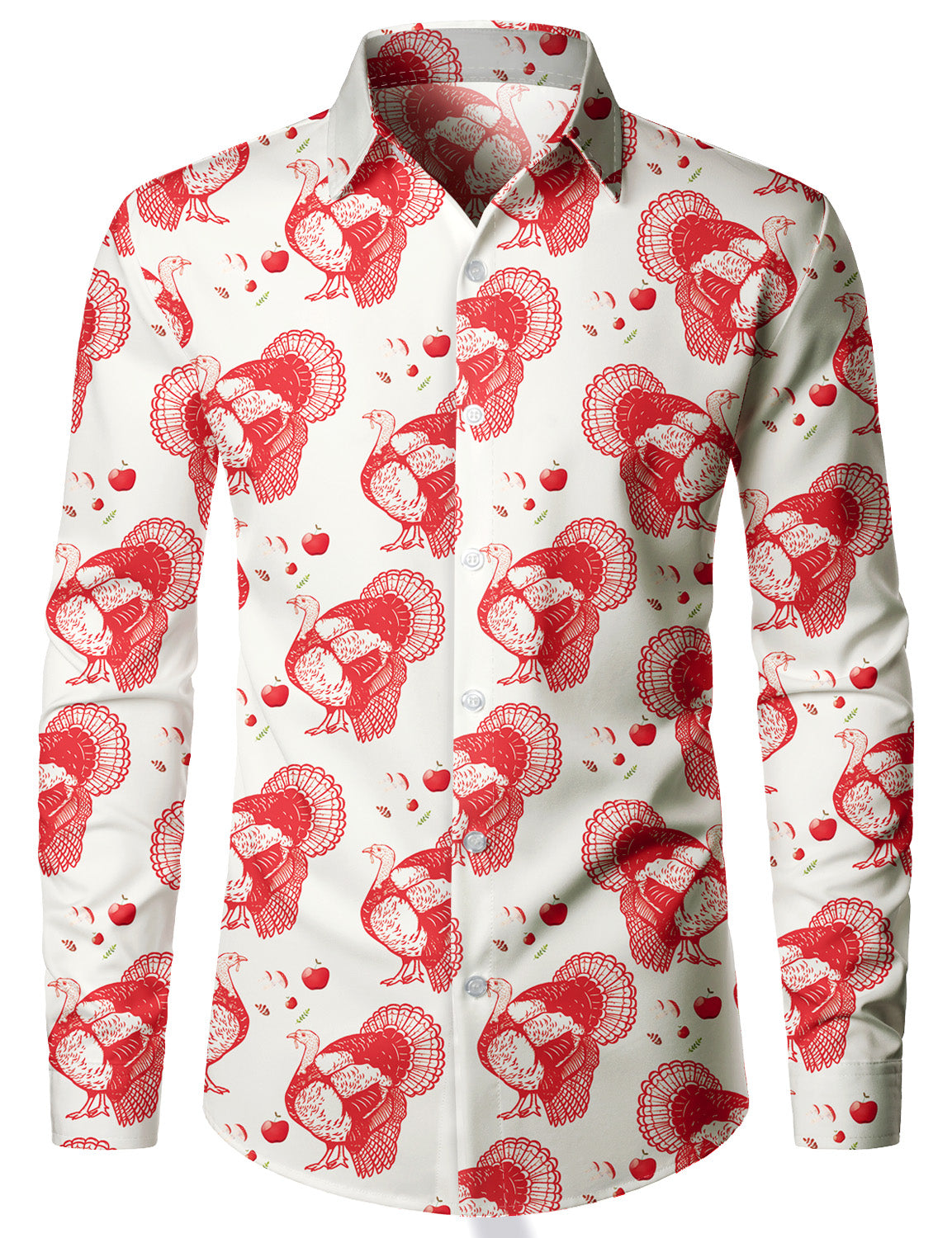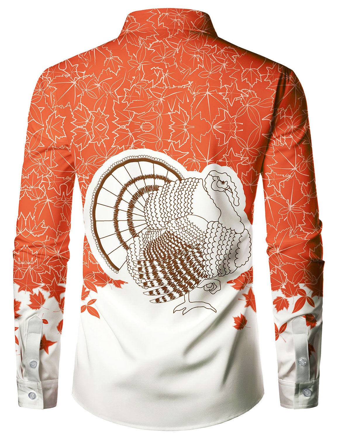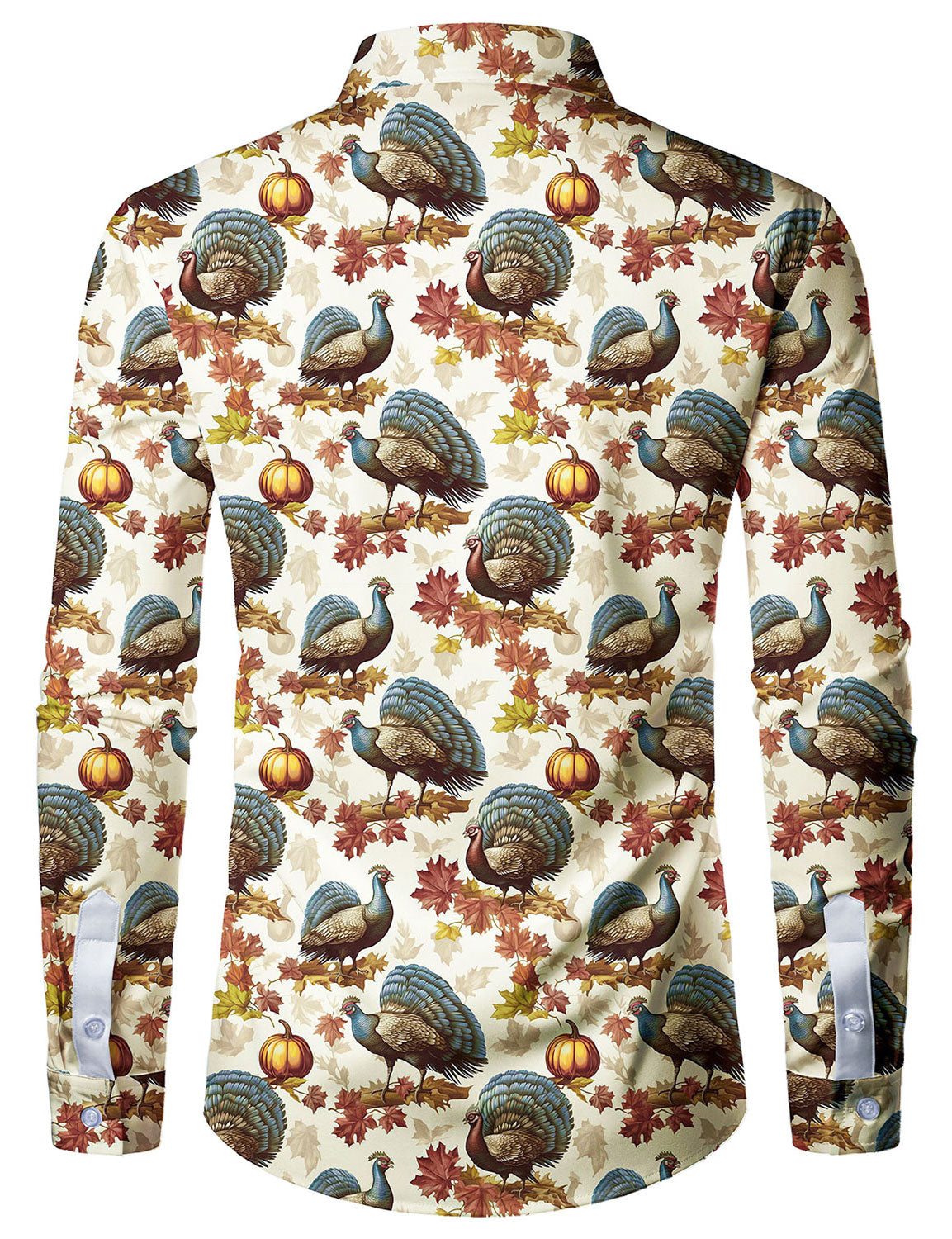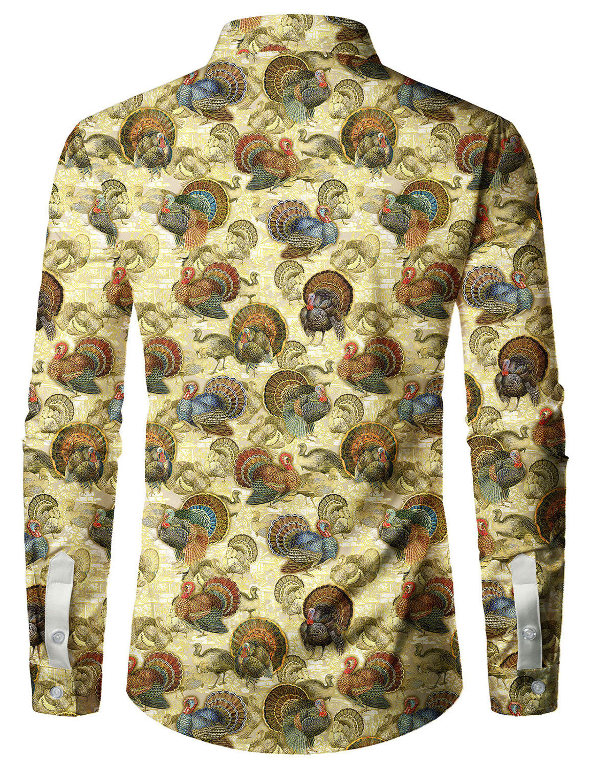 Men's Cute Turkey Print Thanksgiving Funny Holiday Button Up Long Sleeve Shirt
