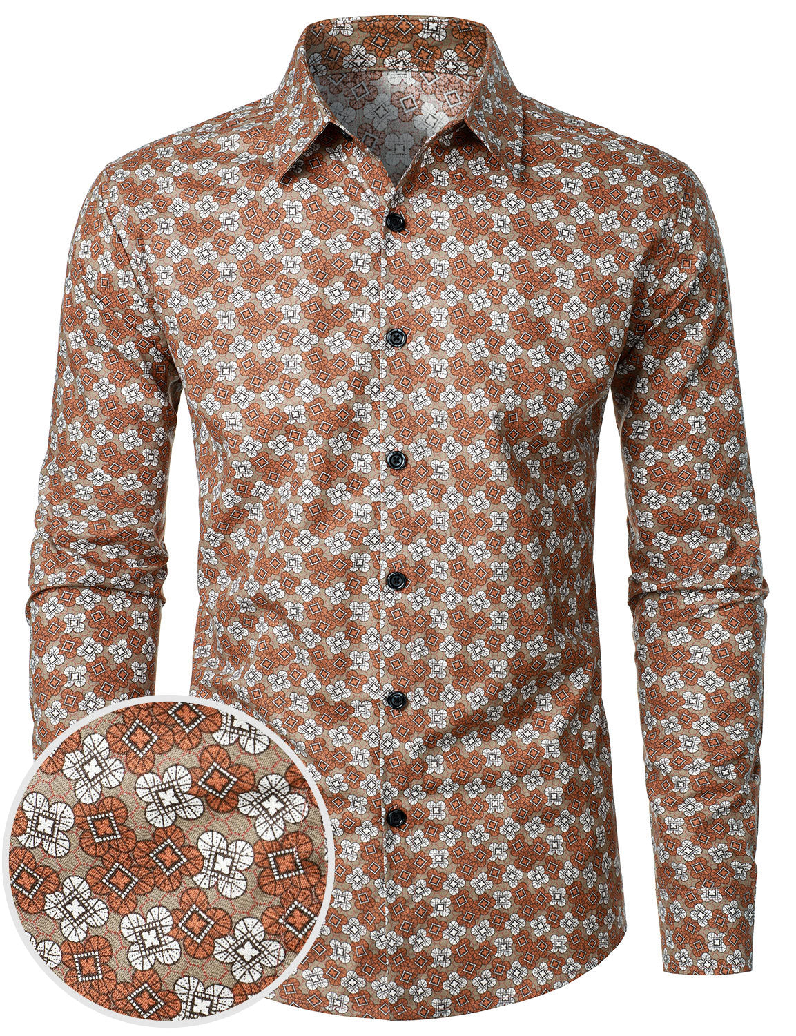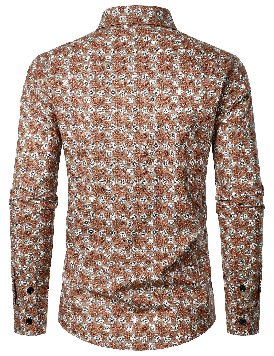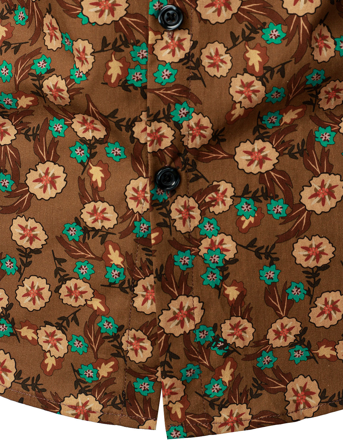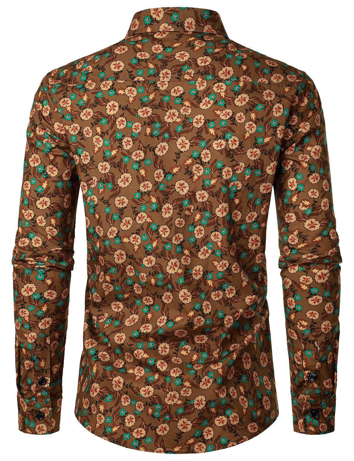 Men's Floral Casual Cotton Brown Long Sleeve Dress Shirt