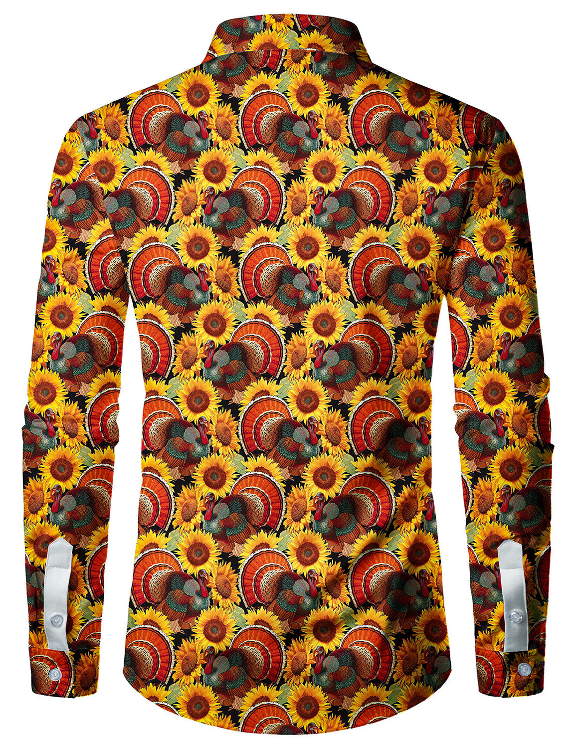 Men's Vintage Thanksgiving Turkey Sunflower Button Up Holiday Long Sleeve Shirt