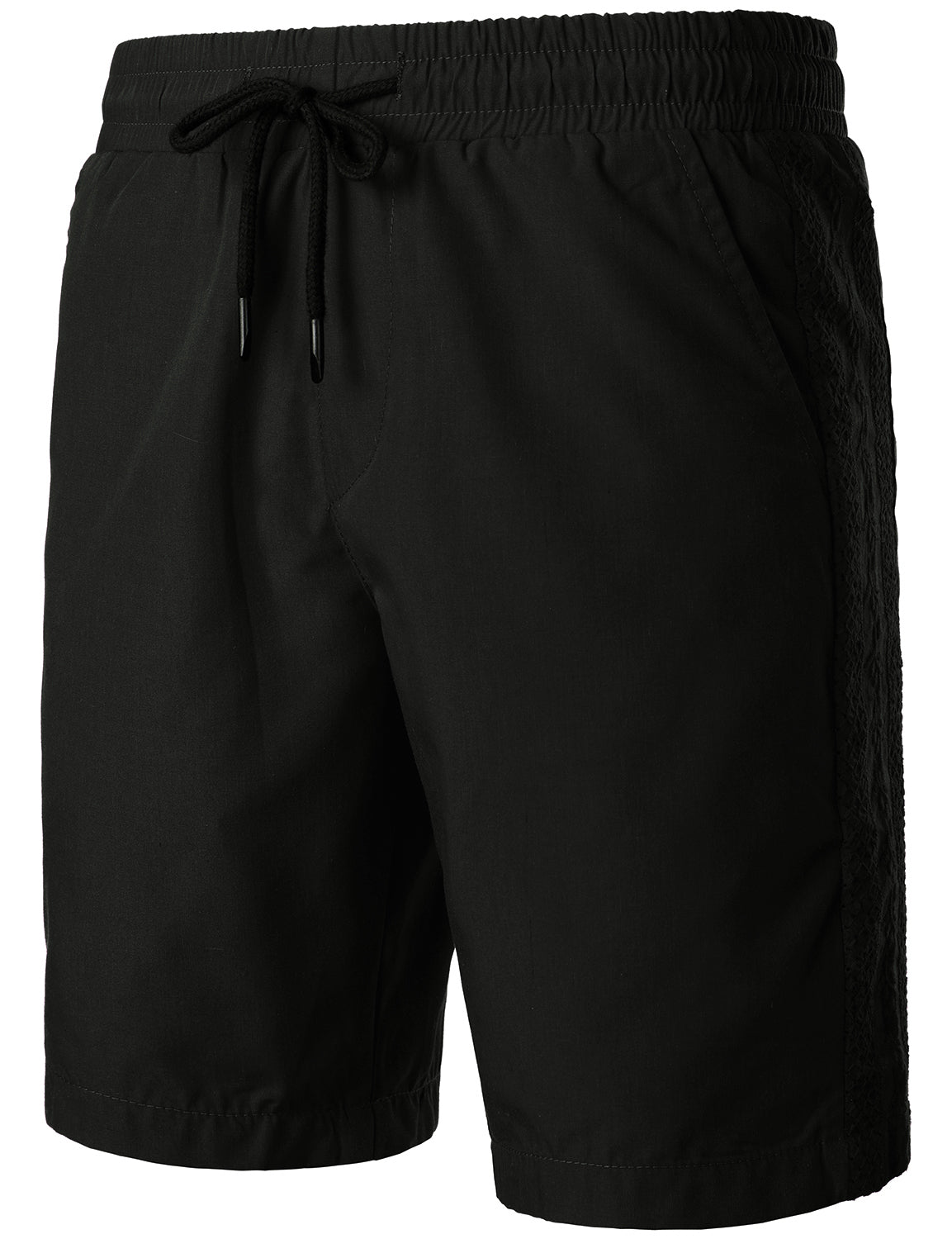 - Flat-front casual shorts with slanted side pockets and rear pockets, mid-rise, elastic waist, and drawstring closure