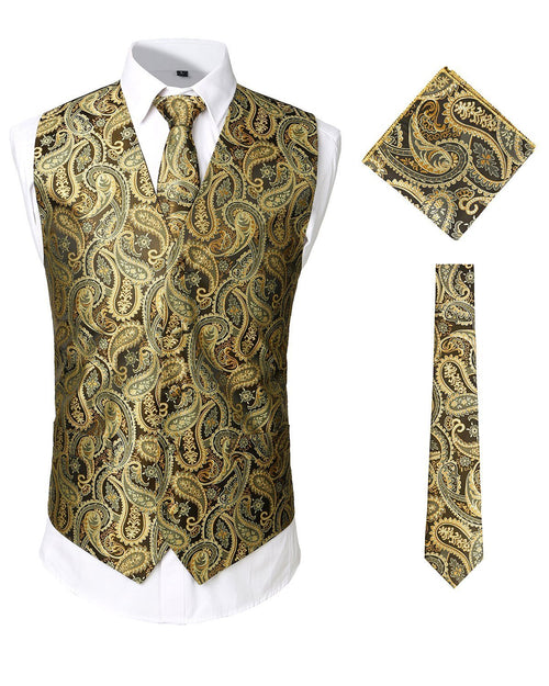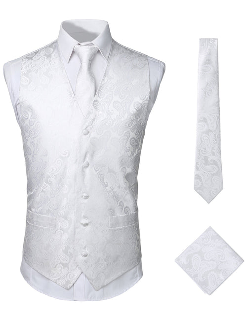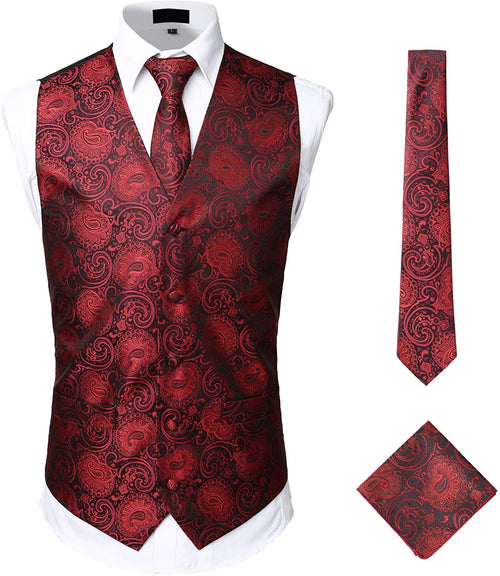 Men's 3pc Jacquard Paisley Vest & Tie Set Classic Necktie Pocket Square Waistcoat for Suit or Tuxedo