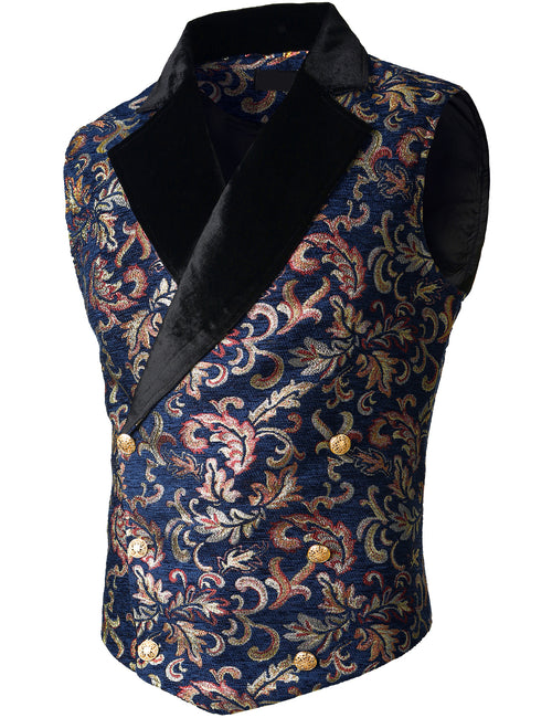 Mens Victorian Double Breasted Vest Vintage Floral Navy Blue Gothic Steampunk Waistcoat