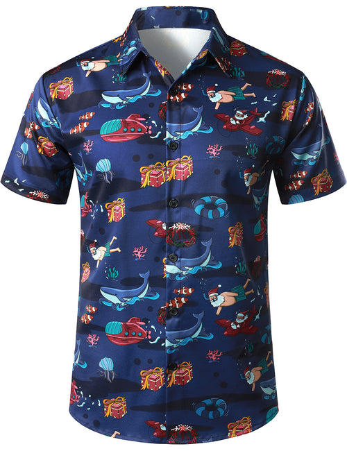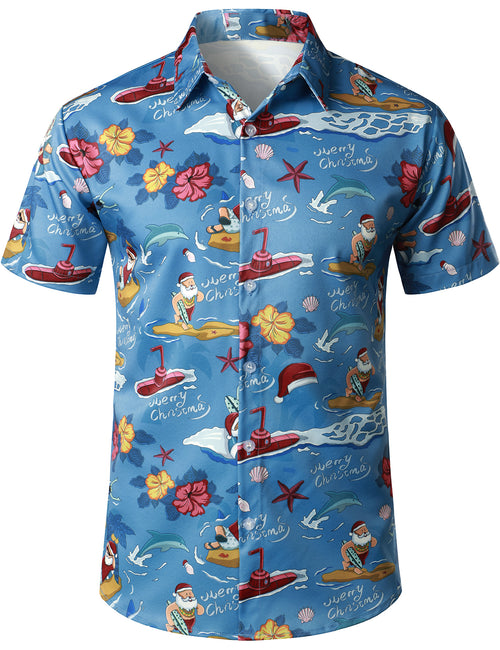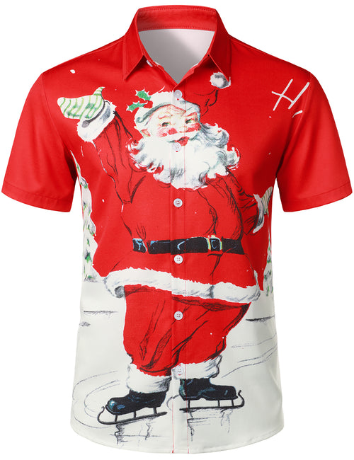 Men's Christmas Santa Claus and Motorcycle Print Button Up Short Sleeve Shirt