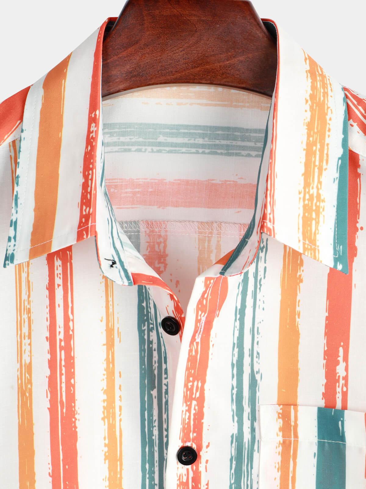 Men's Casual Orange Striped Summer Button Retro Pocket Short Sleeve Shirt