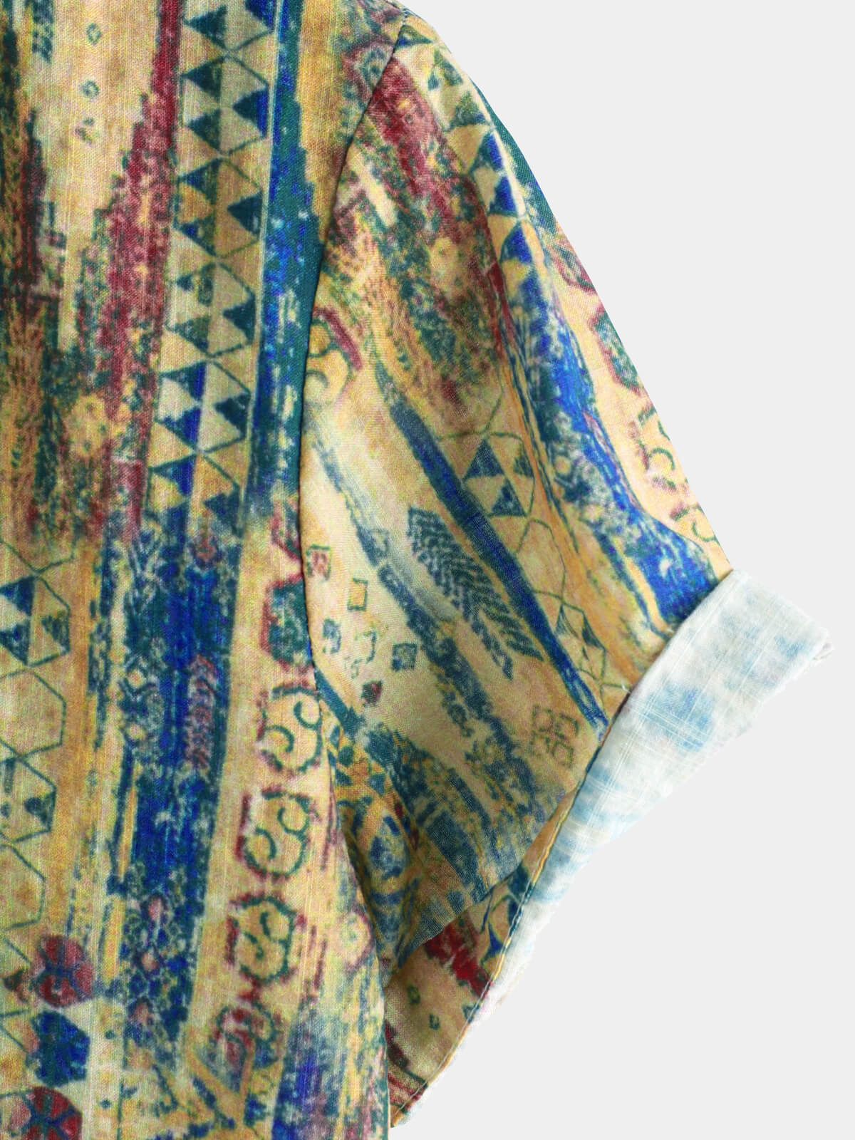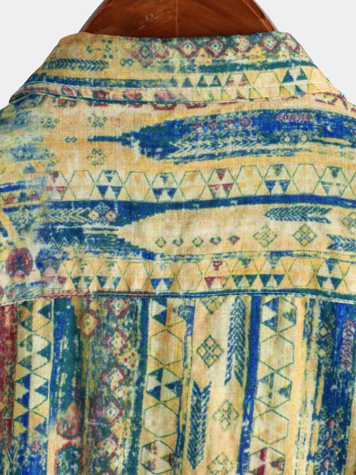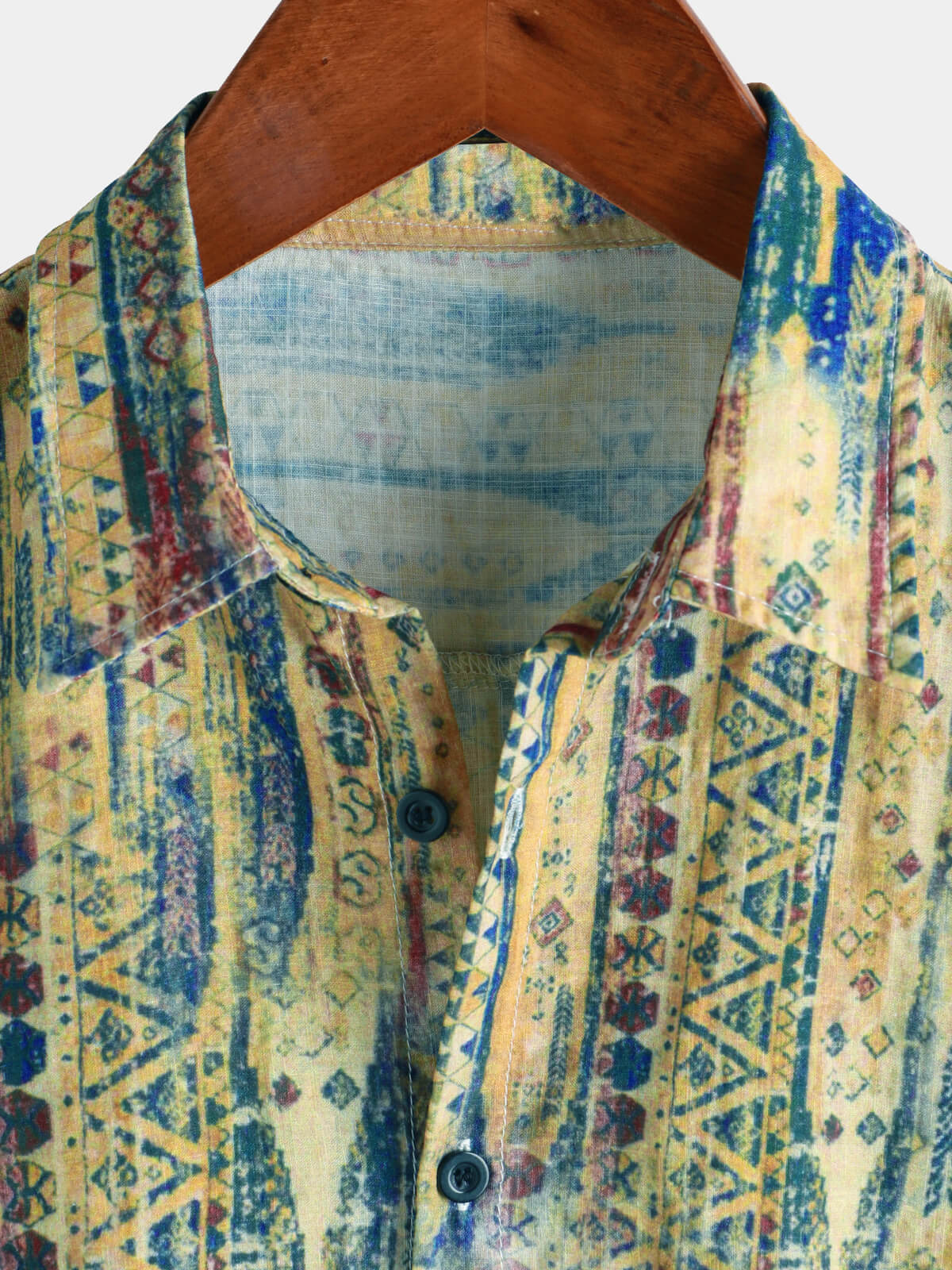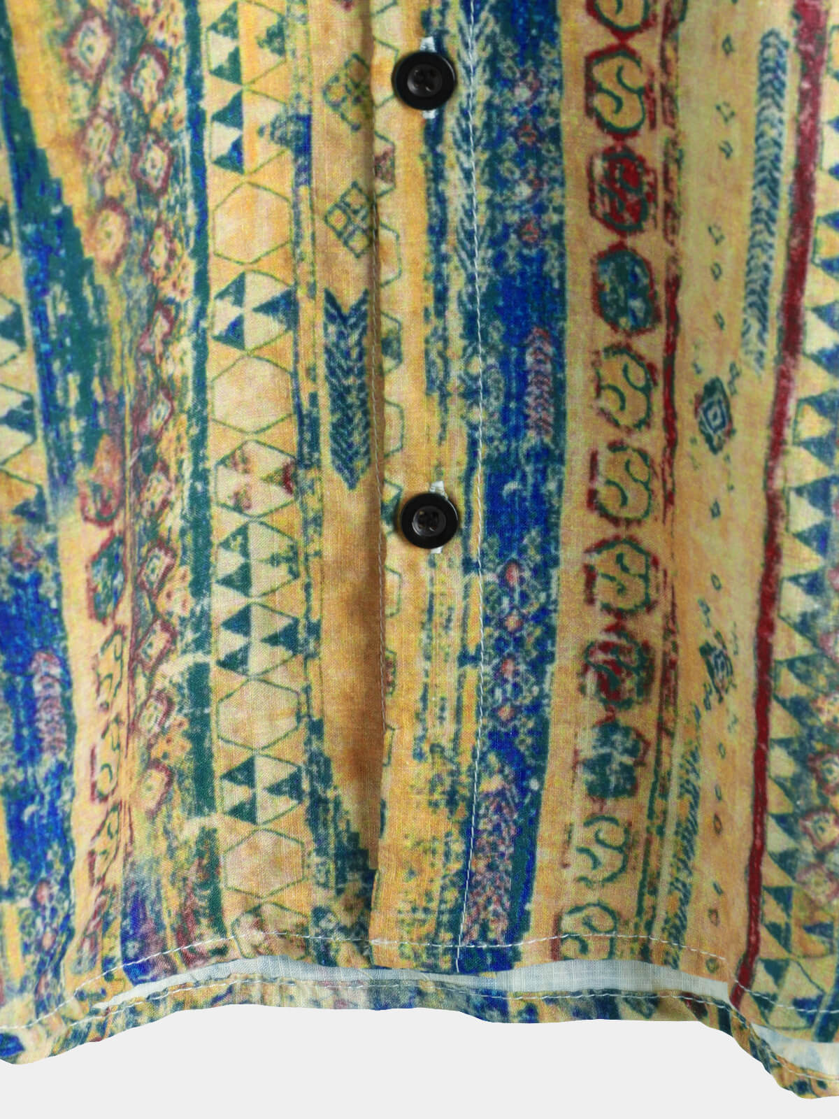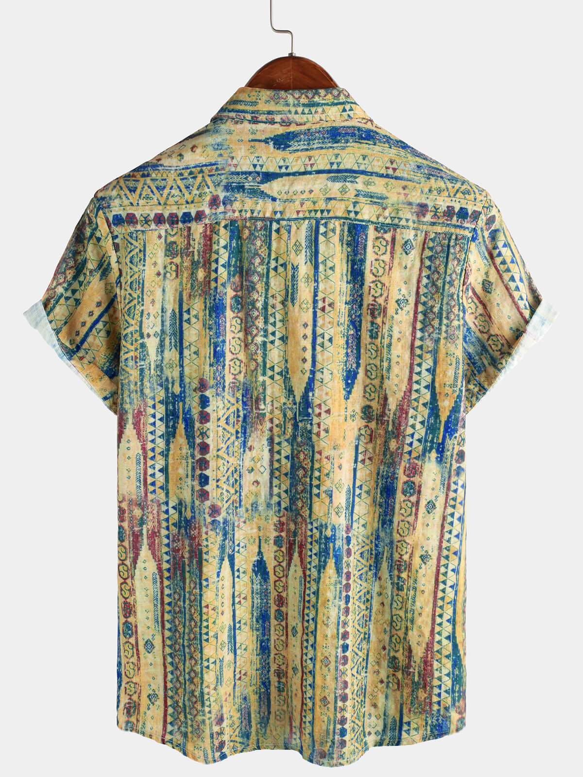 Men's Retro Striped Yellow Button Up Short Sleeve Shirt