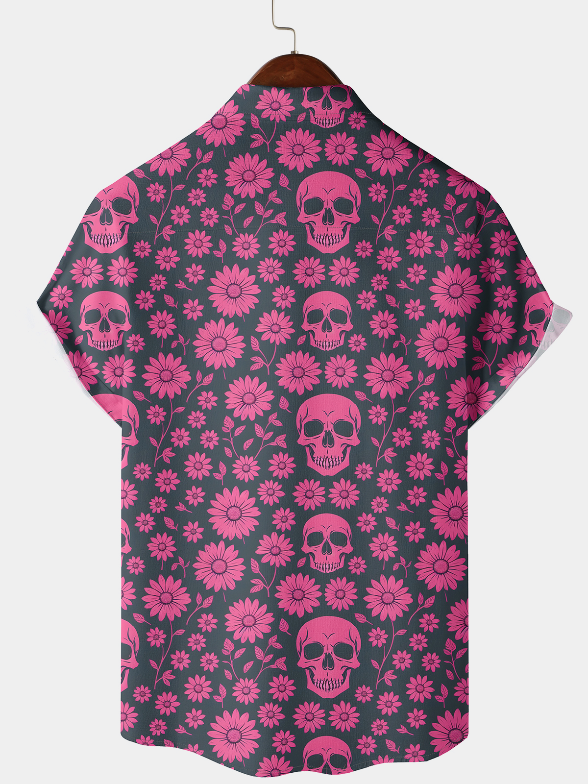 Men's Summer Pink Skull Floral Daisy Print Button Up Holiday Short Sleeve Shirt