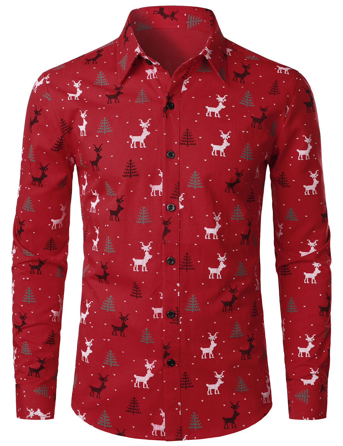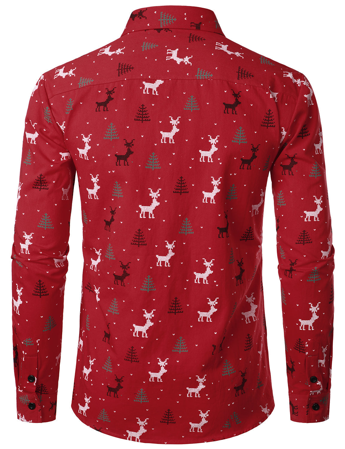 Men's Christmas Print Holiday Regular Fit Red Button Long Sleeve Dress Shirt