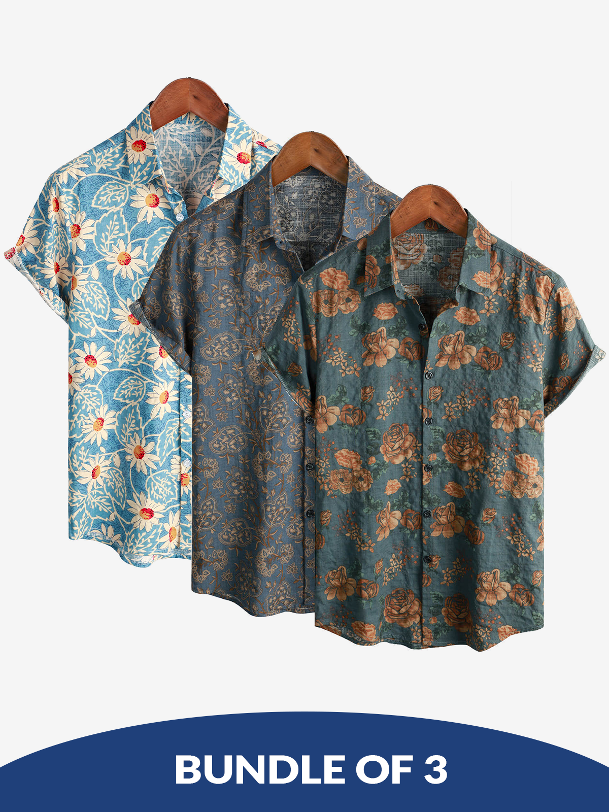 Bundle Of 3 | Men's Paisley Vintage Floral 70s Retro Button Up Beach Short Sleeve Shirt