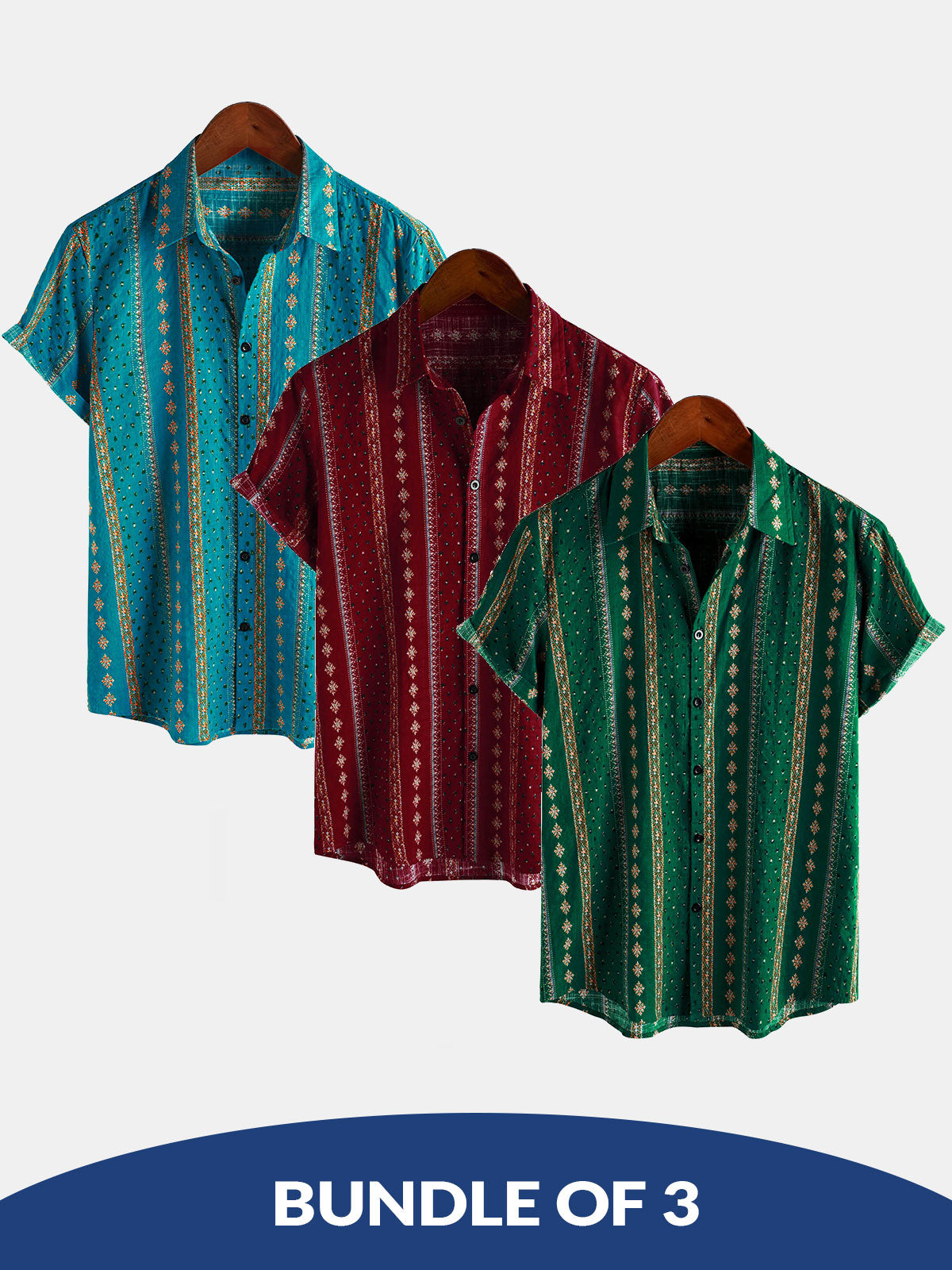 Bundle Of 3 | Men's Retro Striped Print Button Up 70s Vintage Short Sleeve Shirt