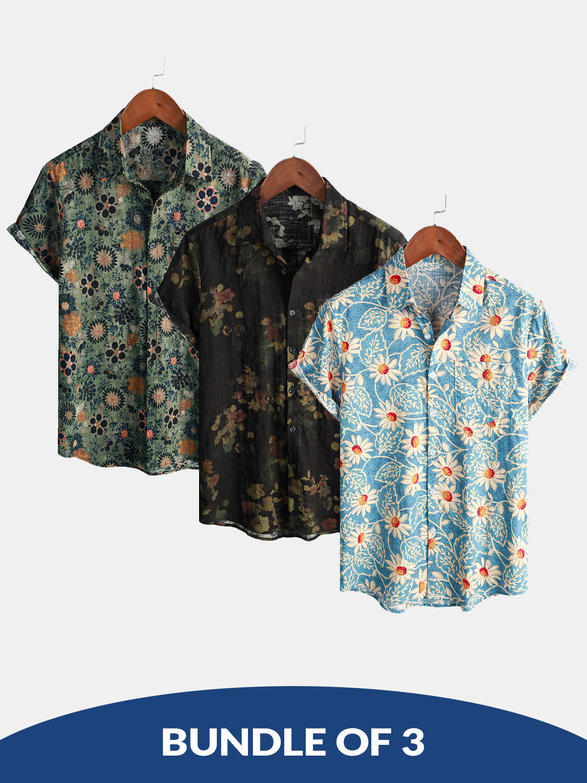 Bundle Of 3 |Men's Vintage Floral Retro Button Up Summer Holiday Short Sleeve Shirt