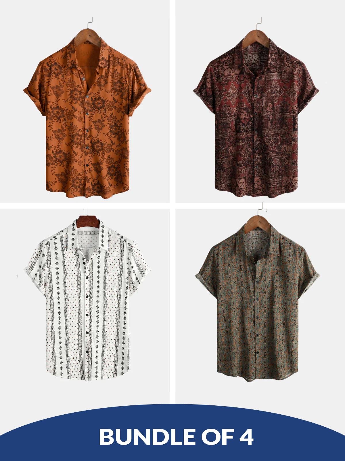 Bundle Of 4 | Men's Vintage Paisley Print 70s Button Up Boho Retro Tribal Short Sleeve Shirt
