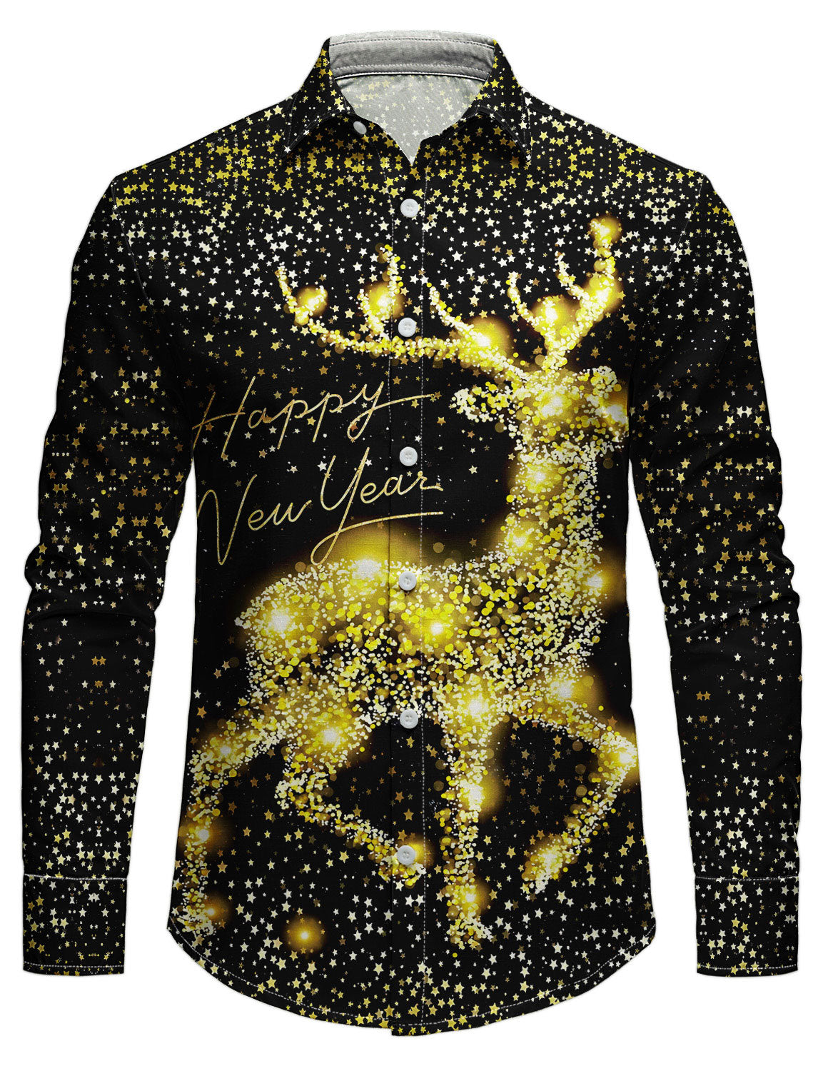 Men's Golden Christmas Reindeer Print Long Sleeve Button Shirt