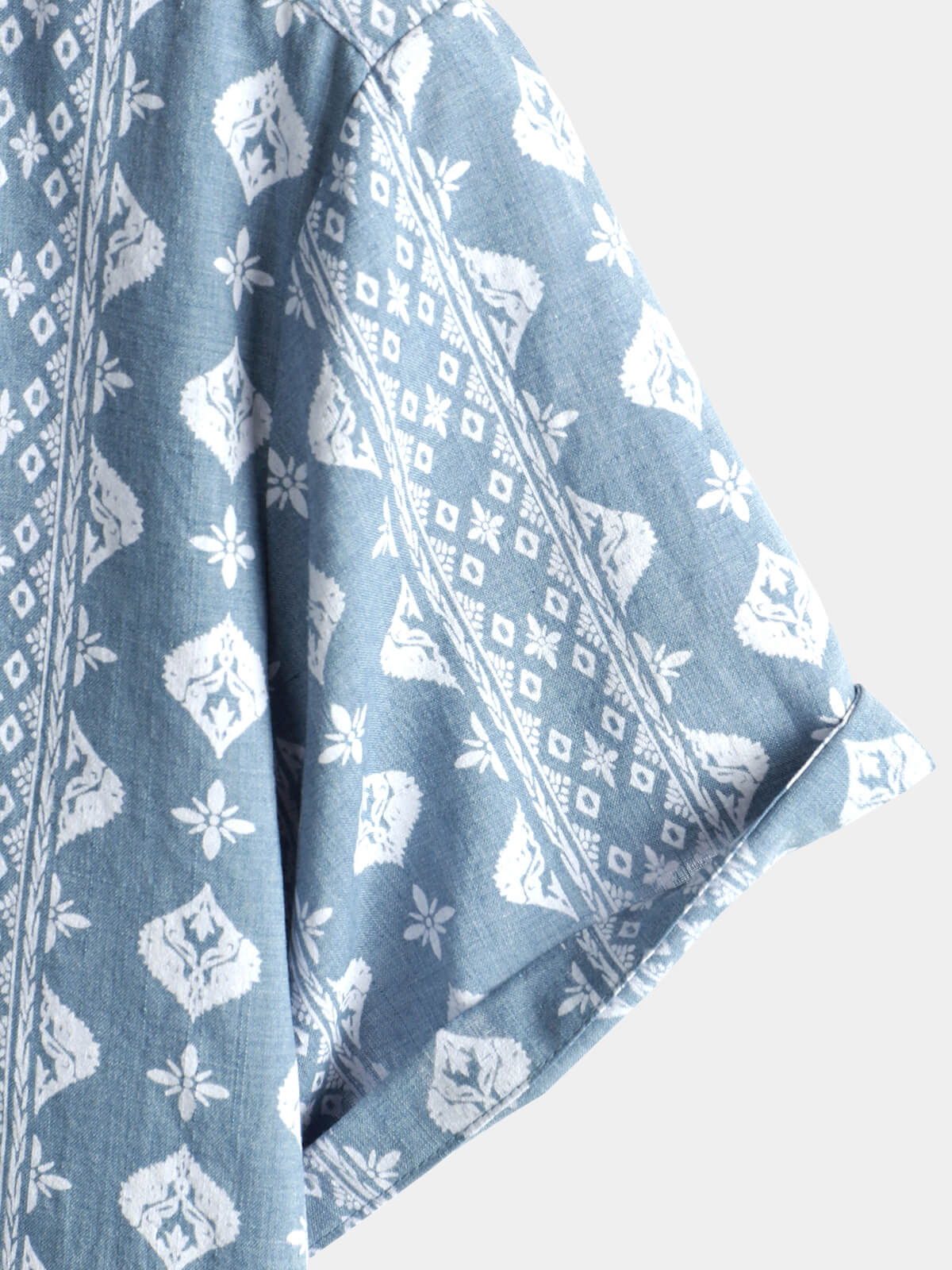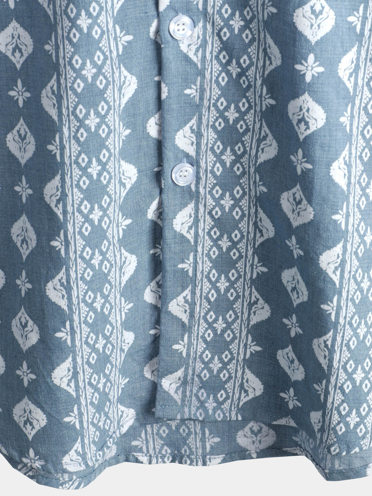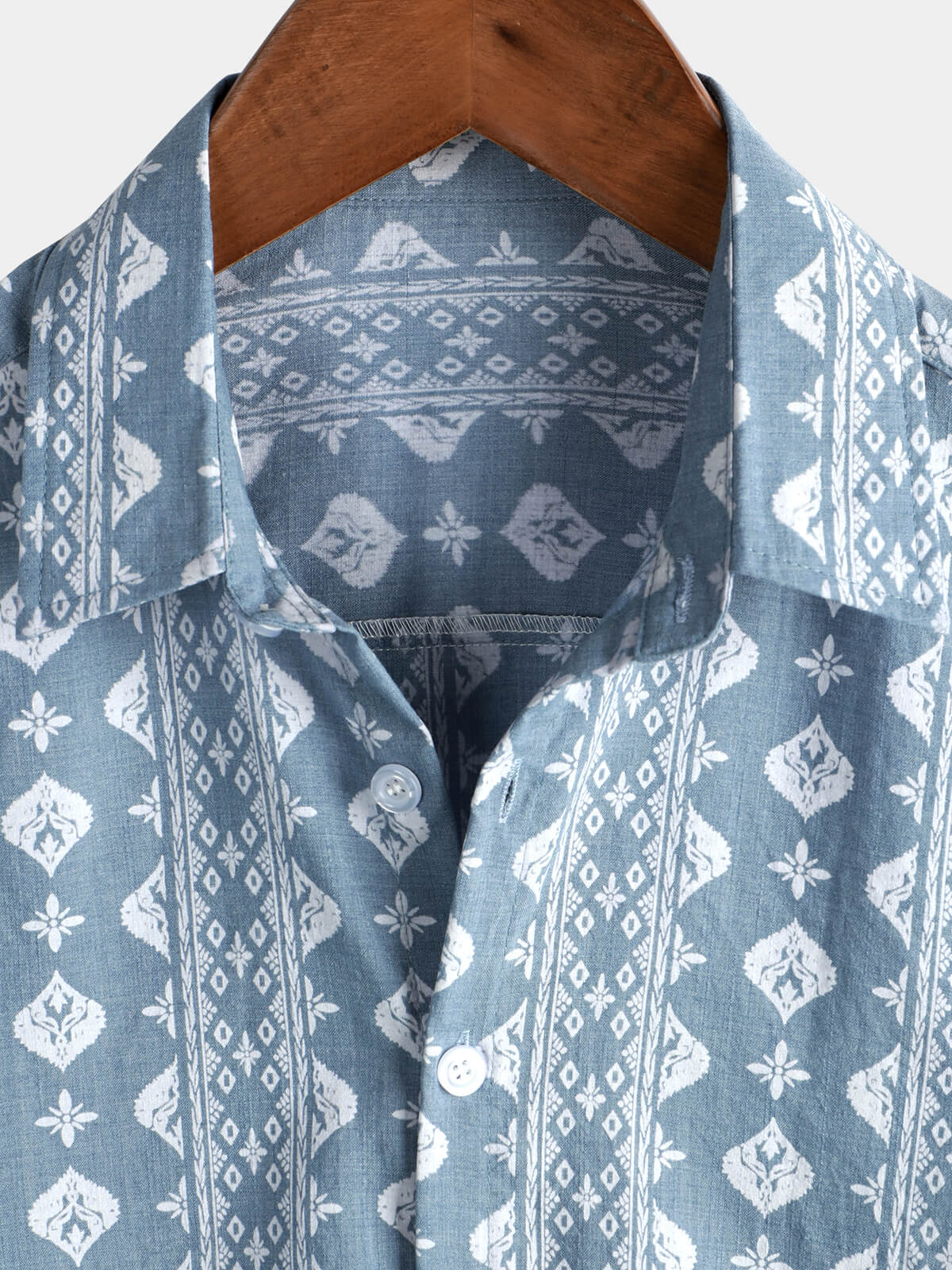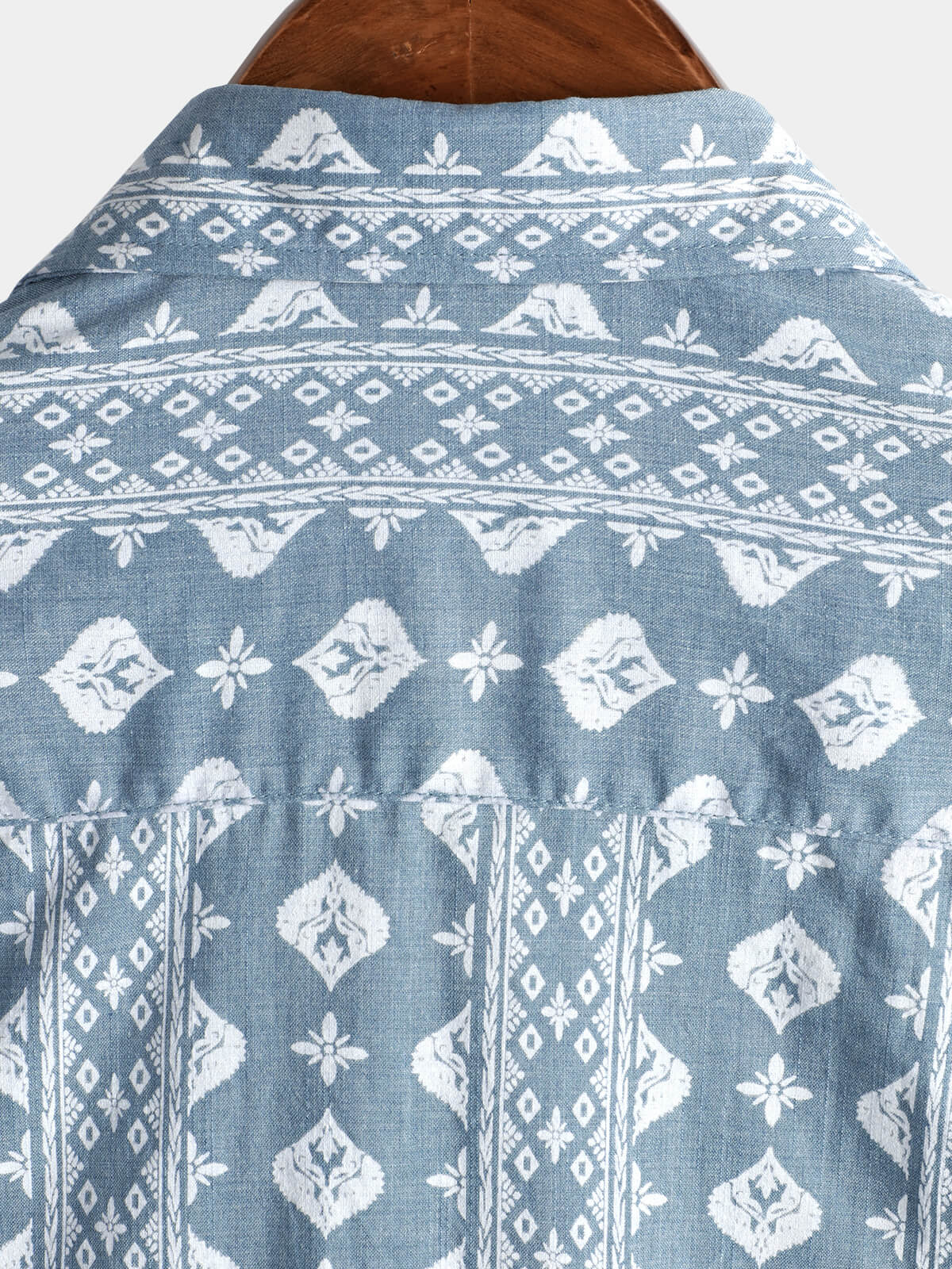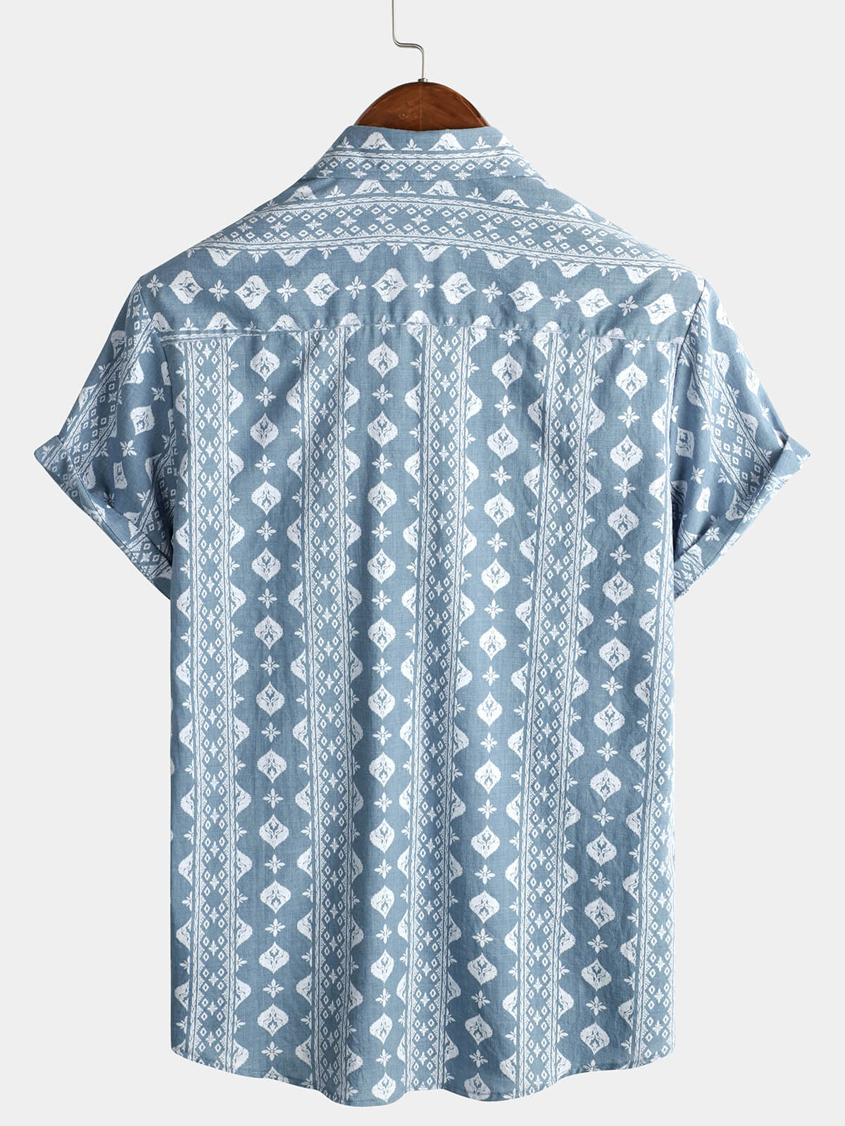 Men's Blue Cotton Retro Button Up Striped Vintage Summer Short Sleeve Shirt