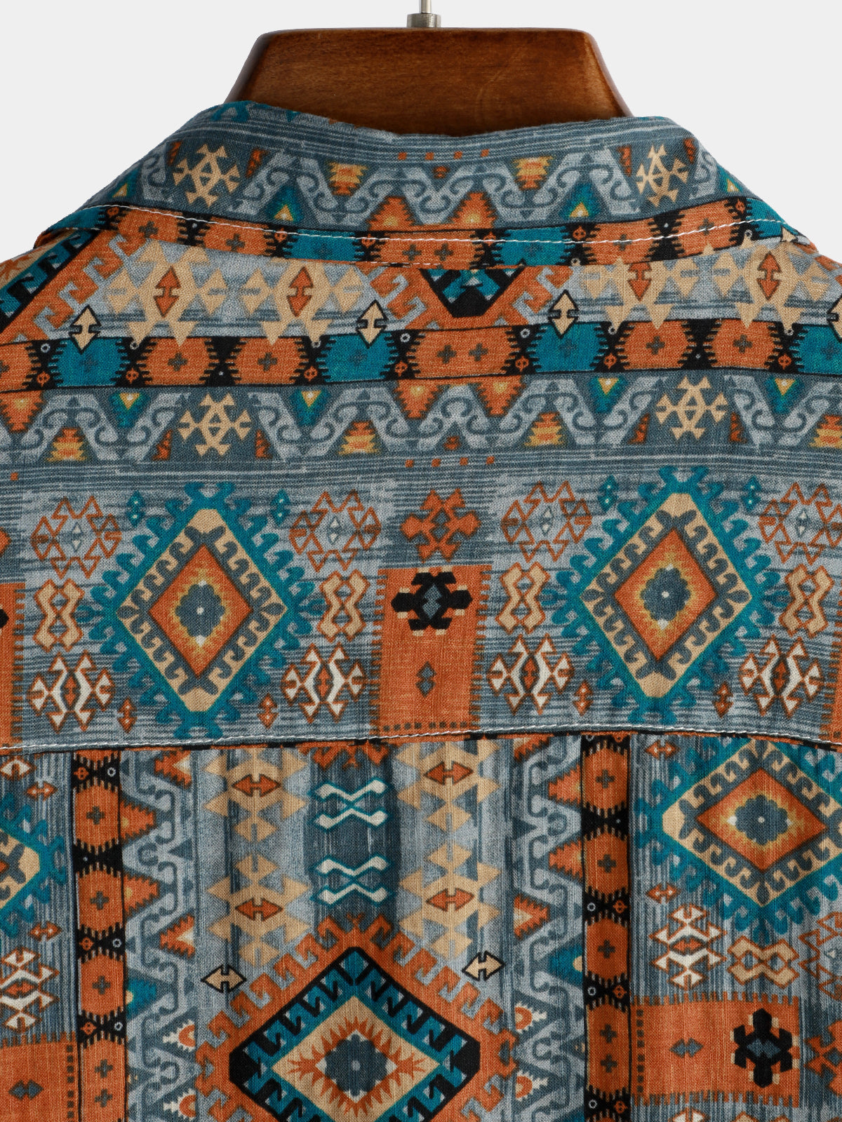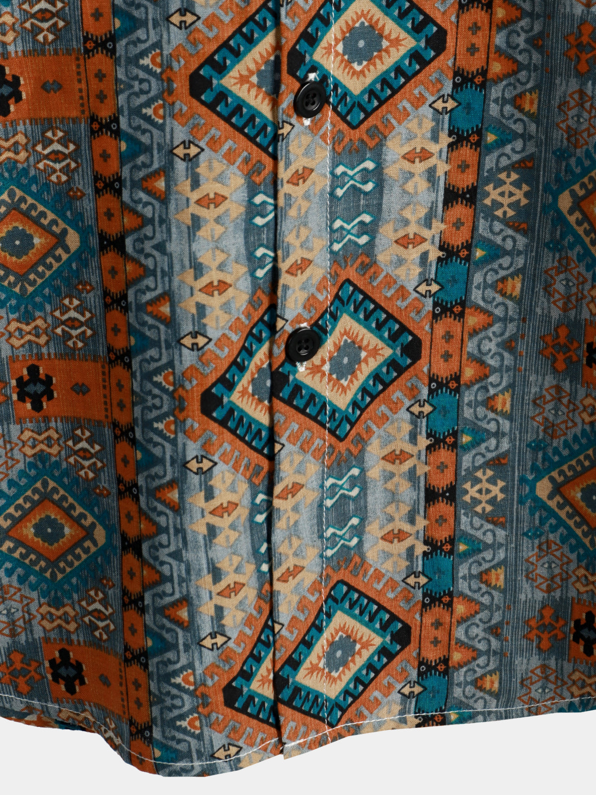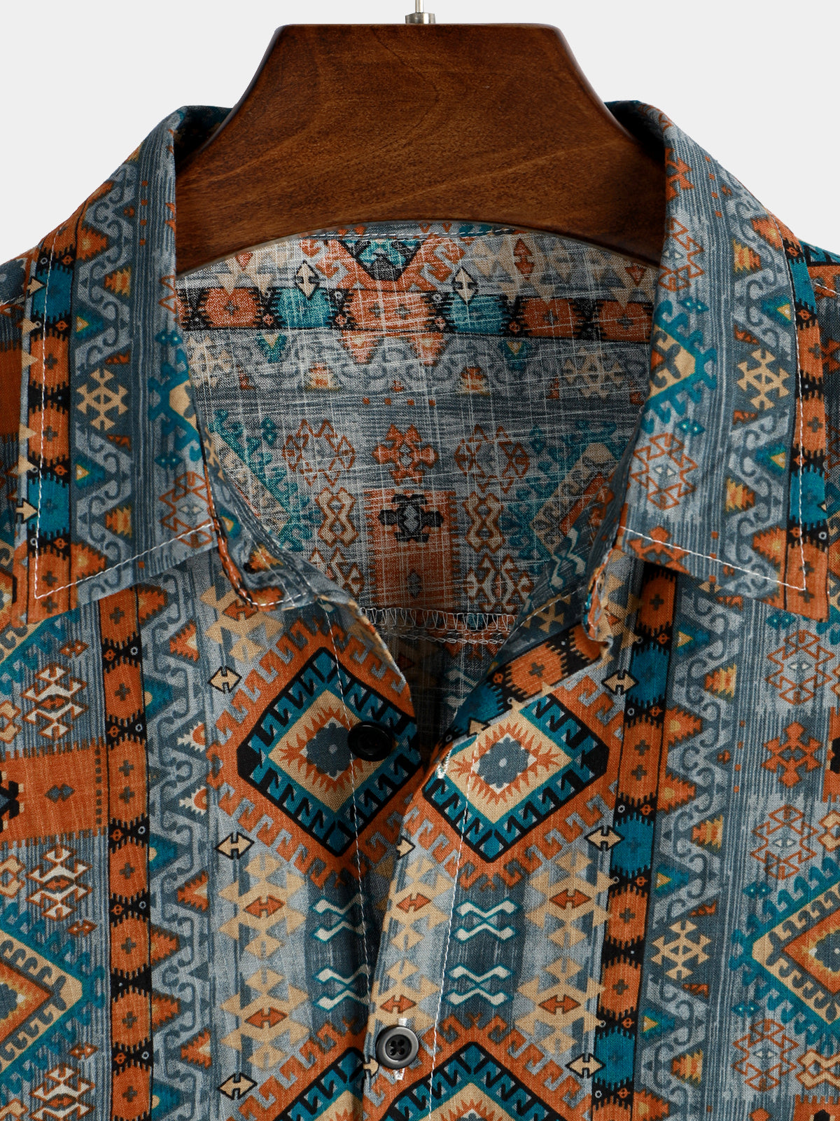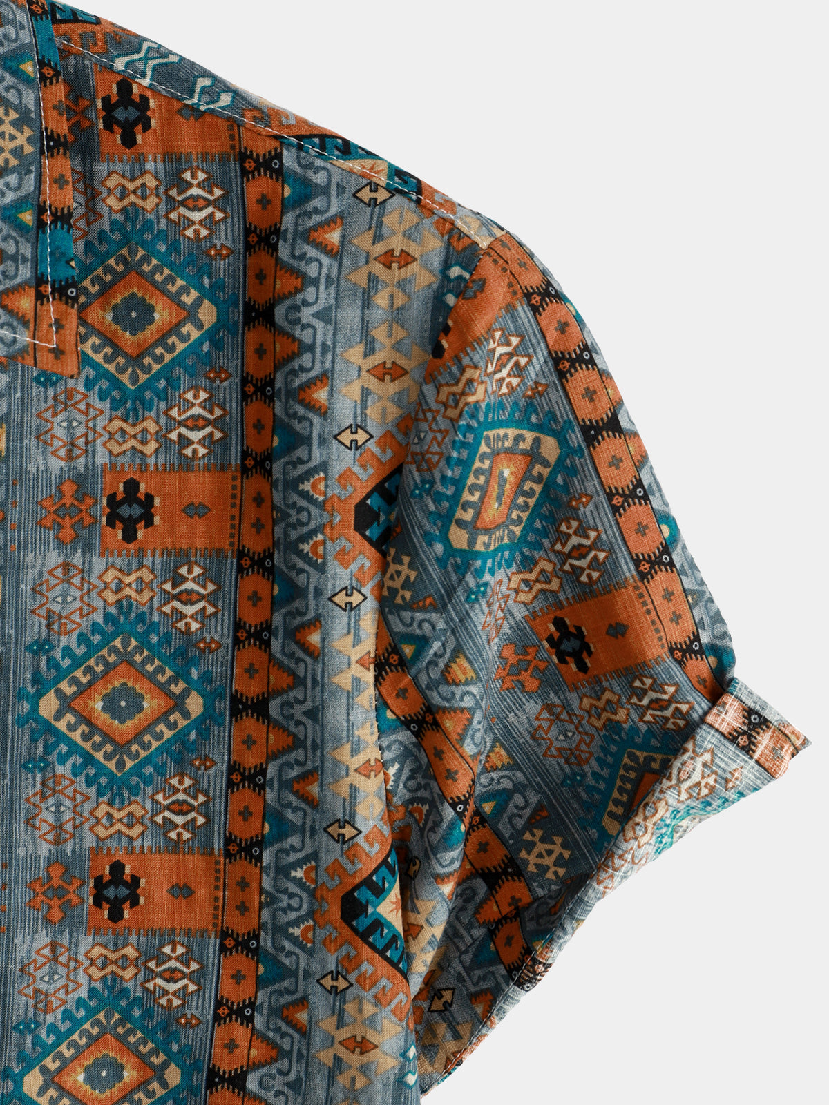 Men's Casual Vintage Short Sleeve 70s Retro Patchwork Button Up Lapel Shirt