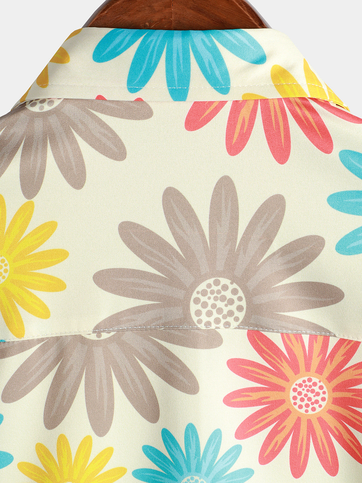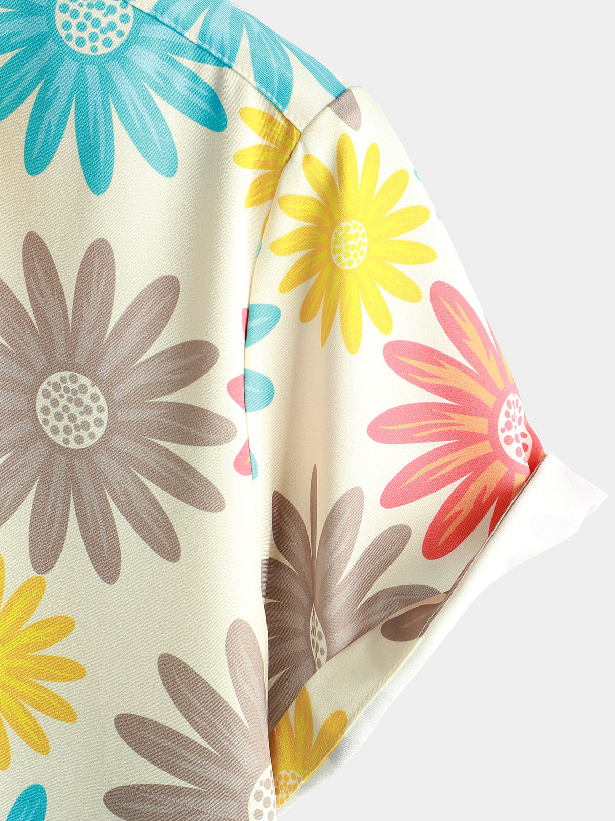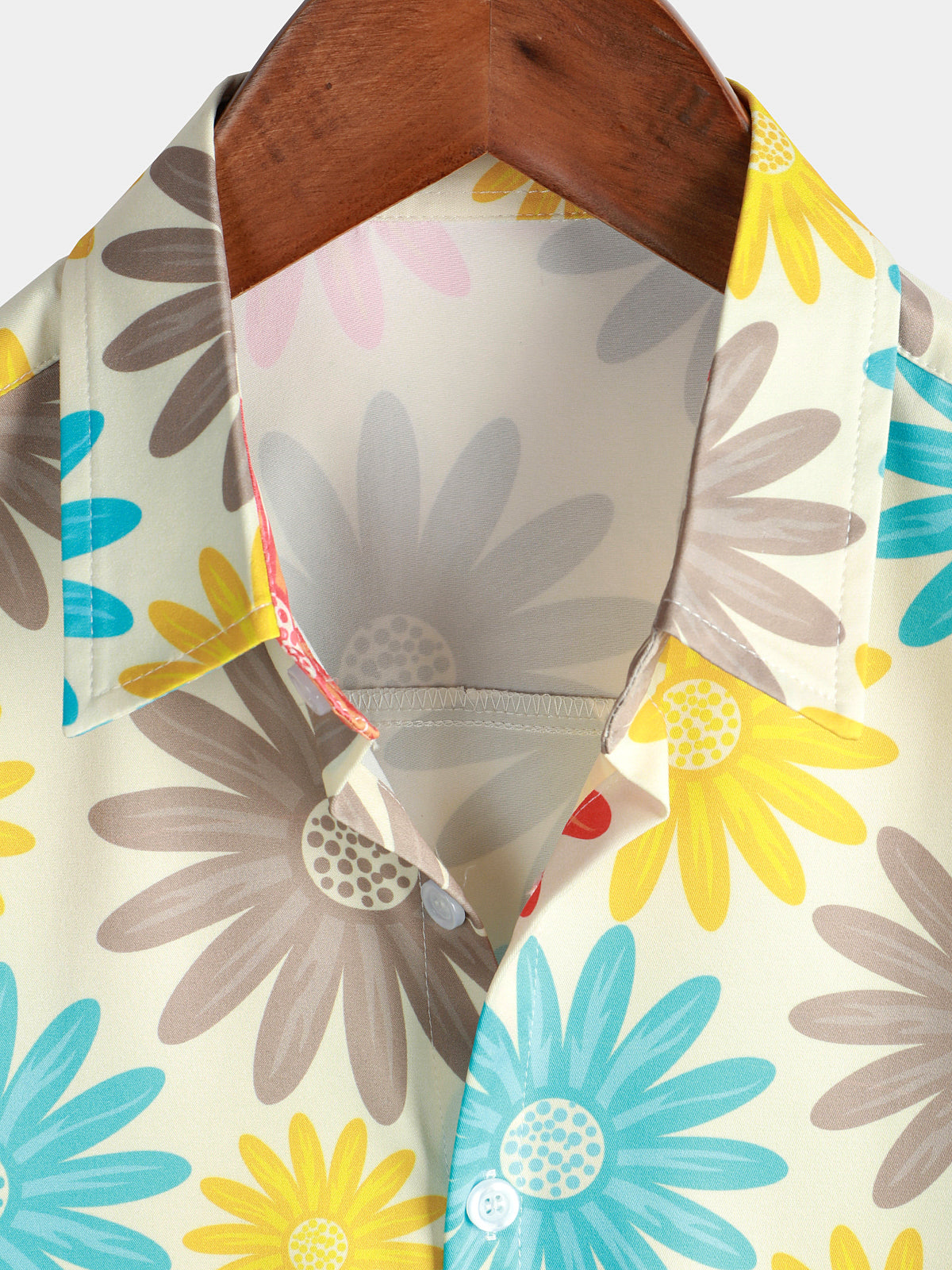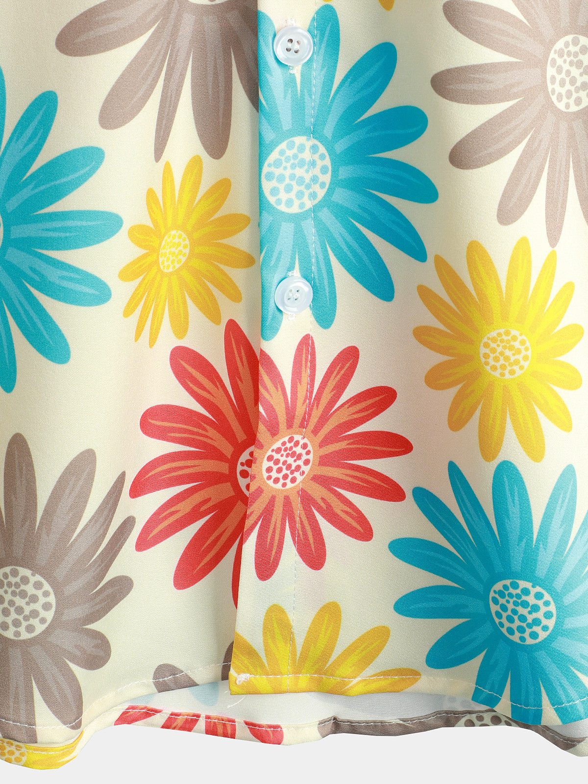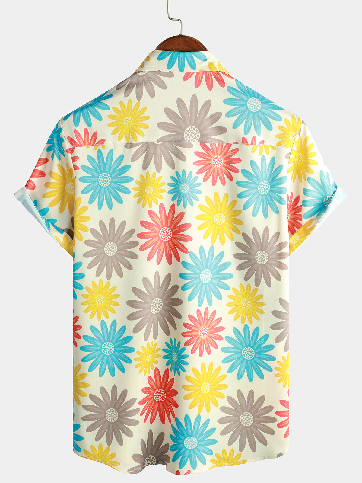 Men's Colorful Daisy Holiday Floral Button Up Casual Summer Beach Short Sleeve Shirt