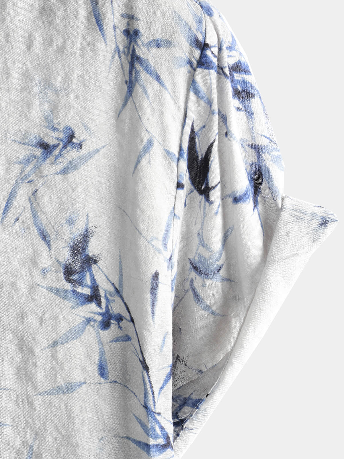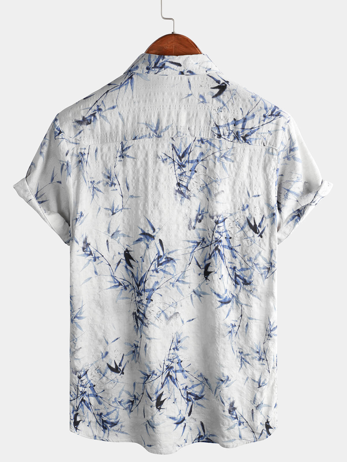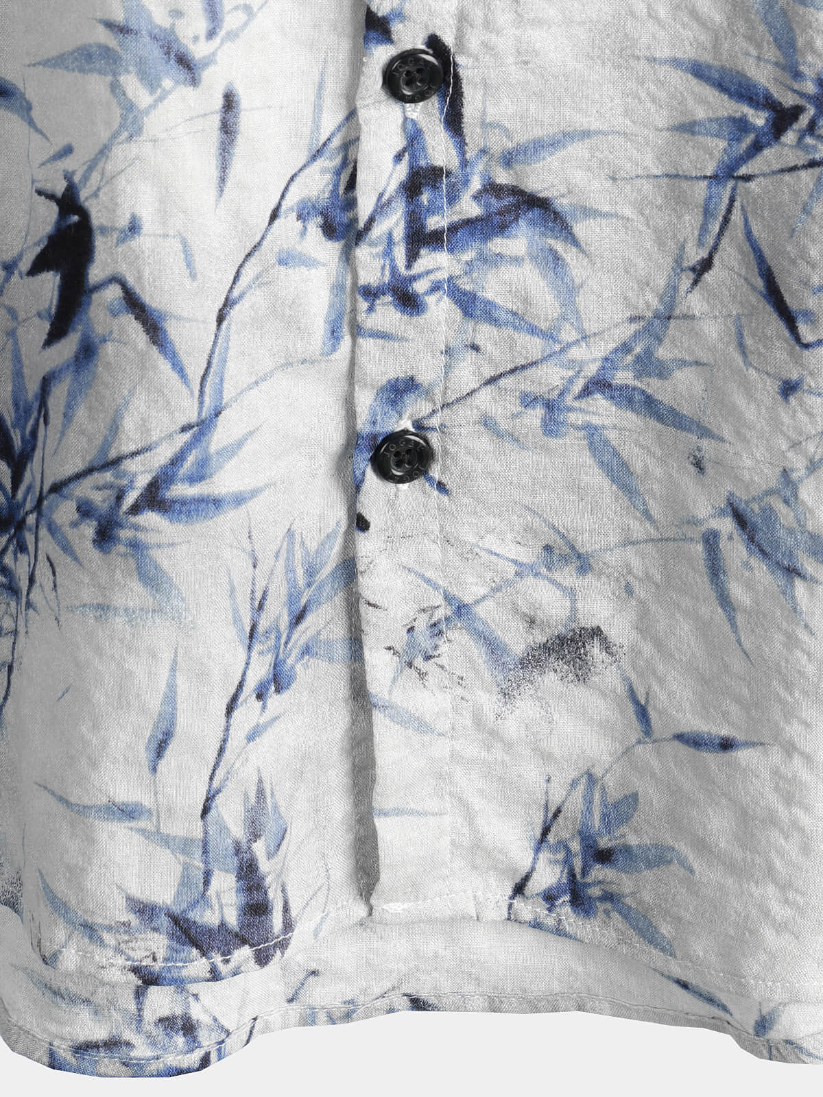 Men's Cotton Bamboo Art Print Button Summer Casual Short Sleeve Light Blue Hawaiian Shirt