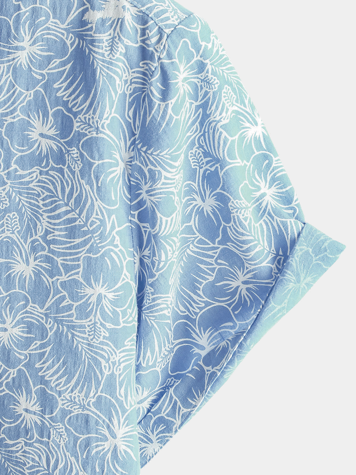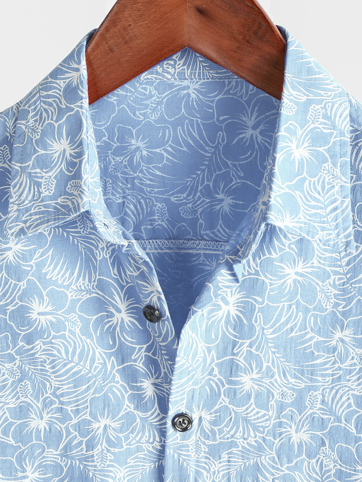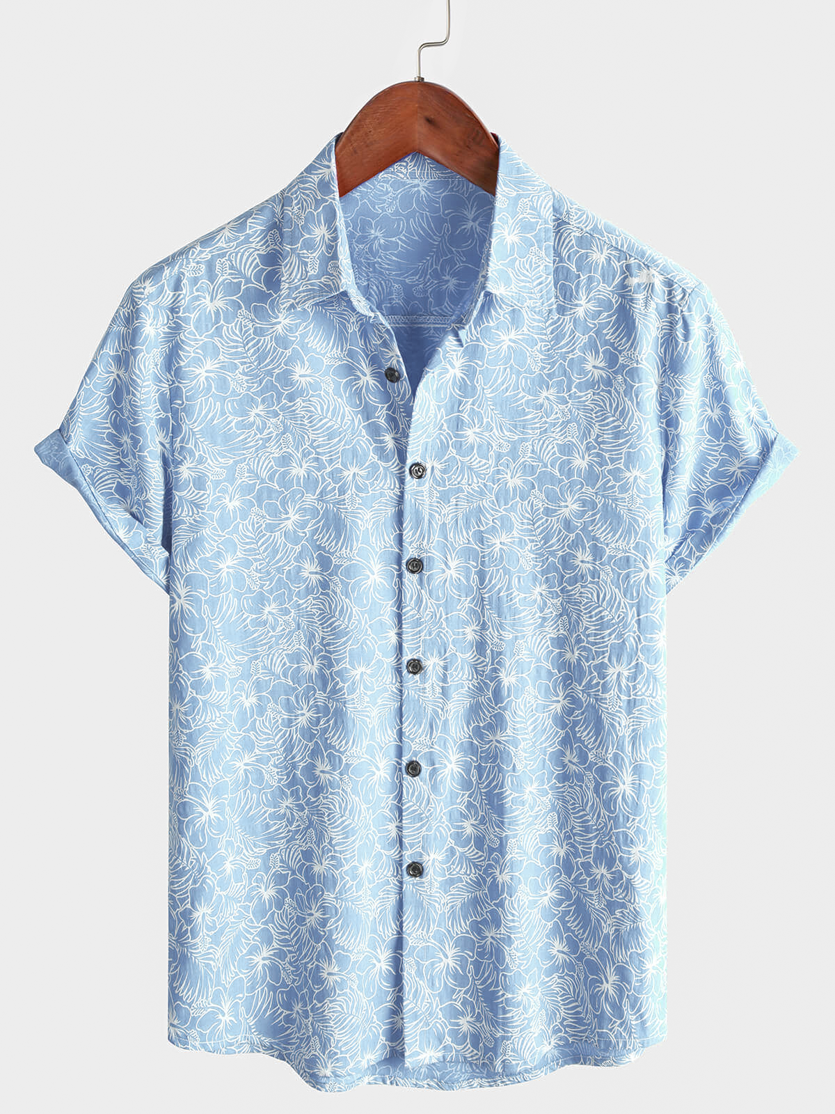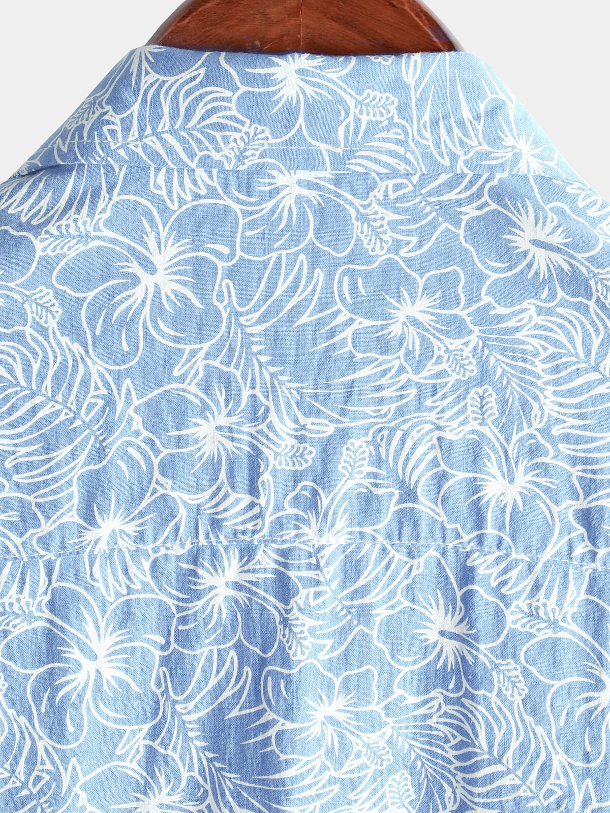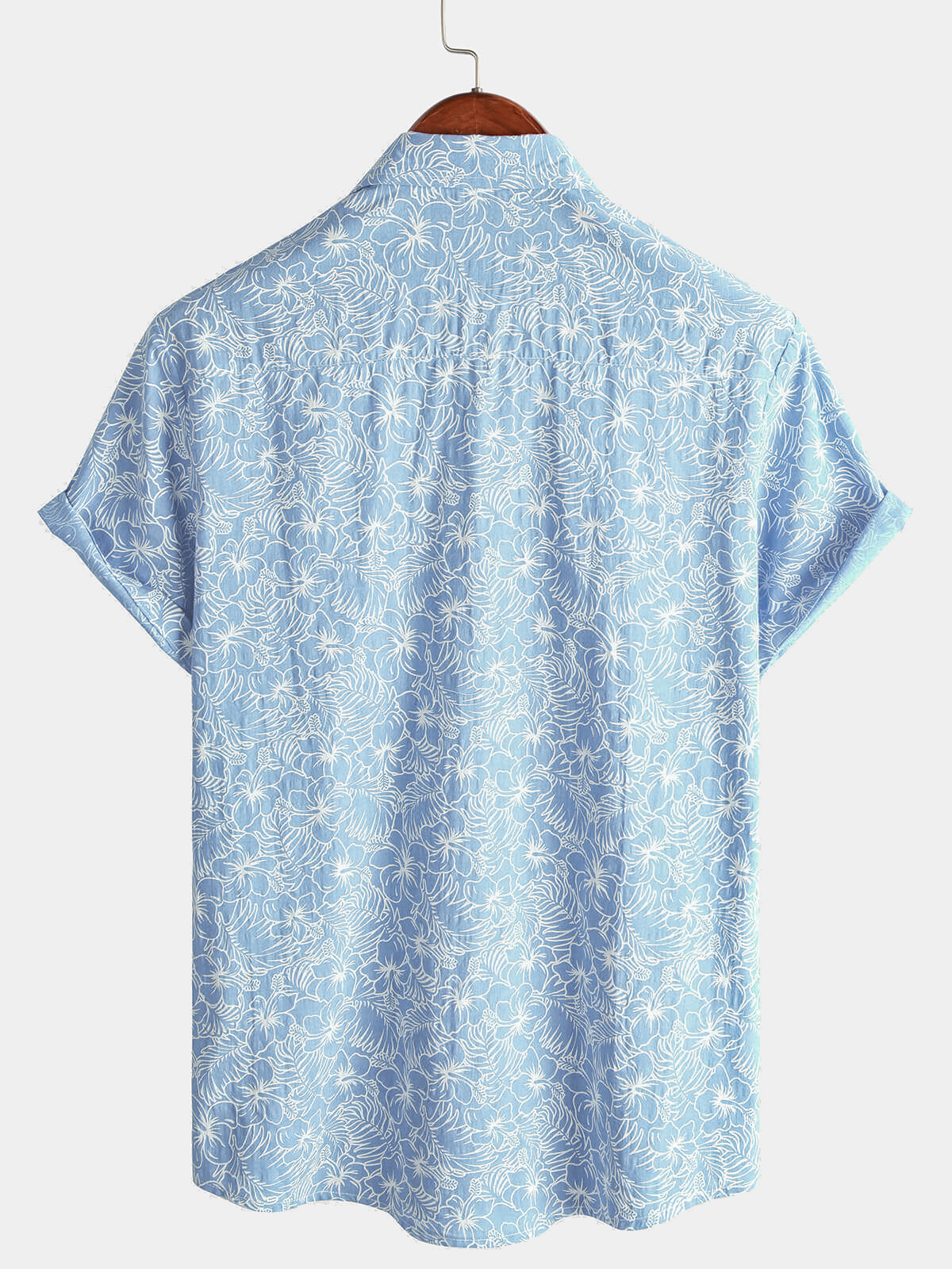 Men's Cotton Floral Holiday Flower Print Button Up Beach Light Blue Hawaiian Short Sleeve Shirt
