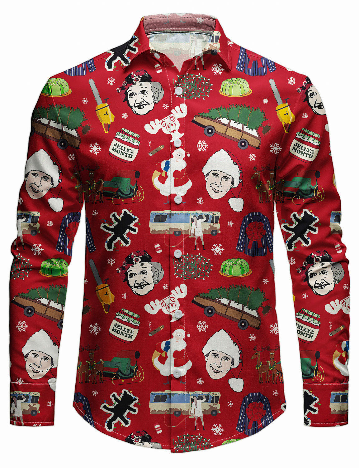 Men's Family Christmas Vacation Themed Print Button Long Sleeve Lapel Shirt