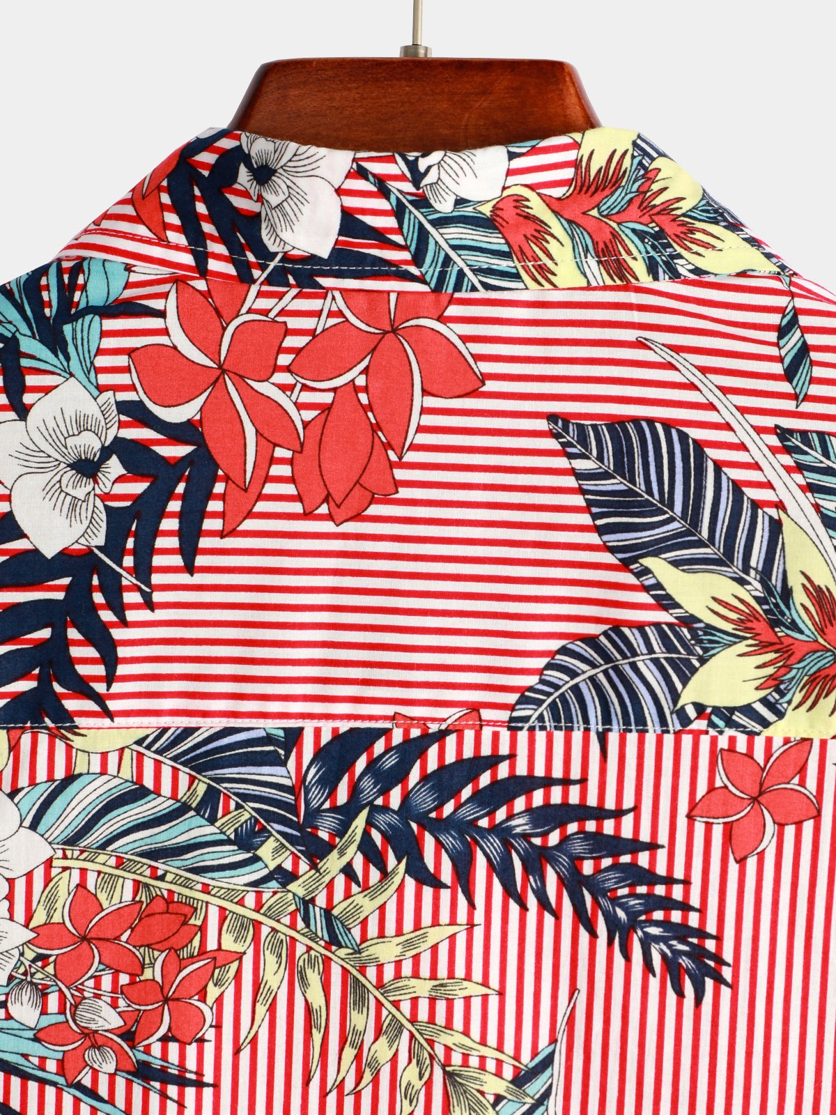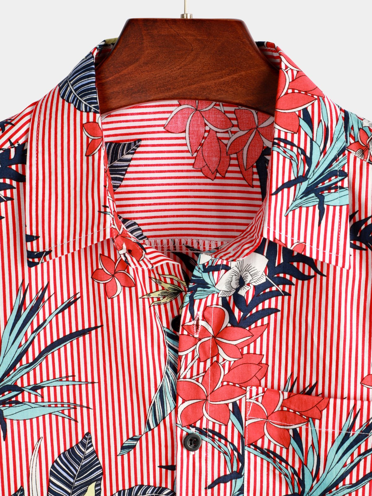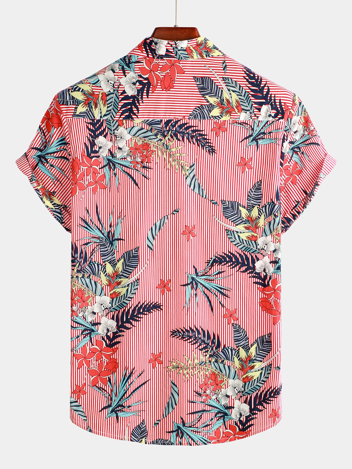 Men's Casual Floral Pocket Cotton Striped Pink Shirt