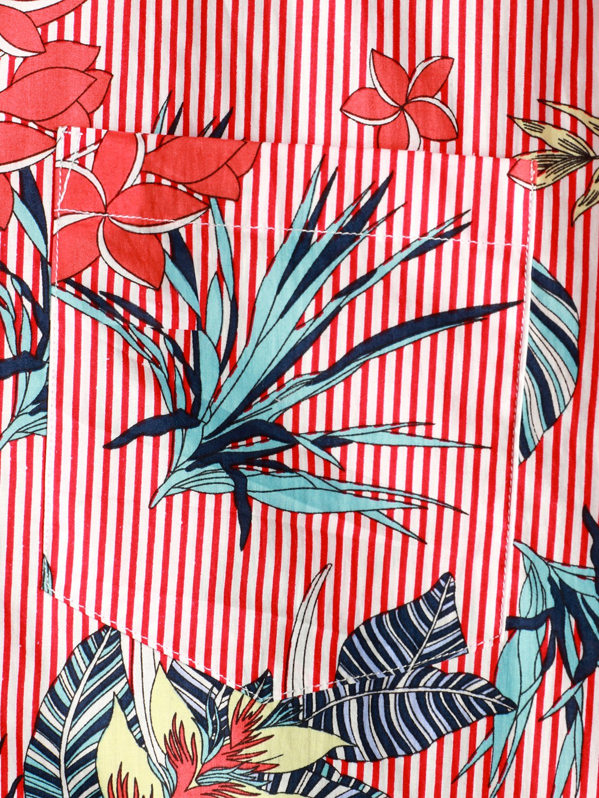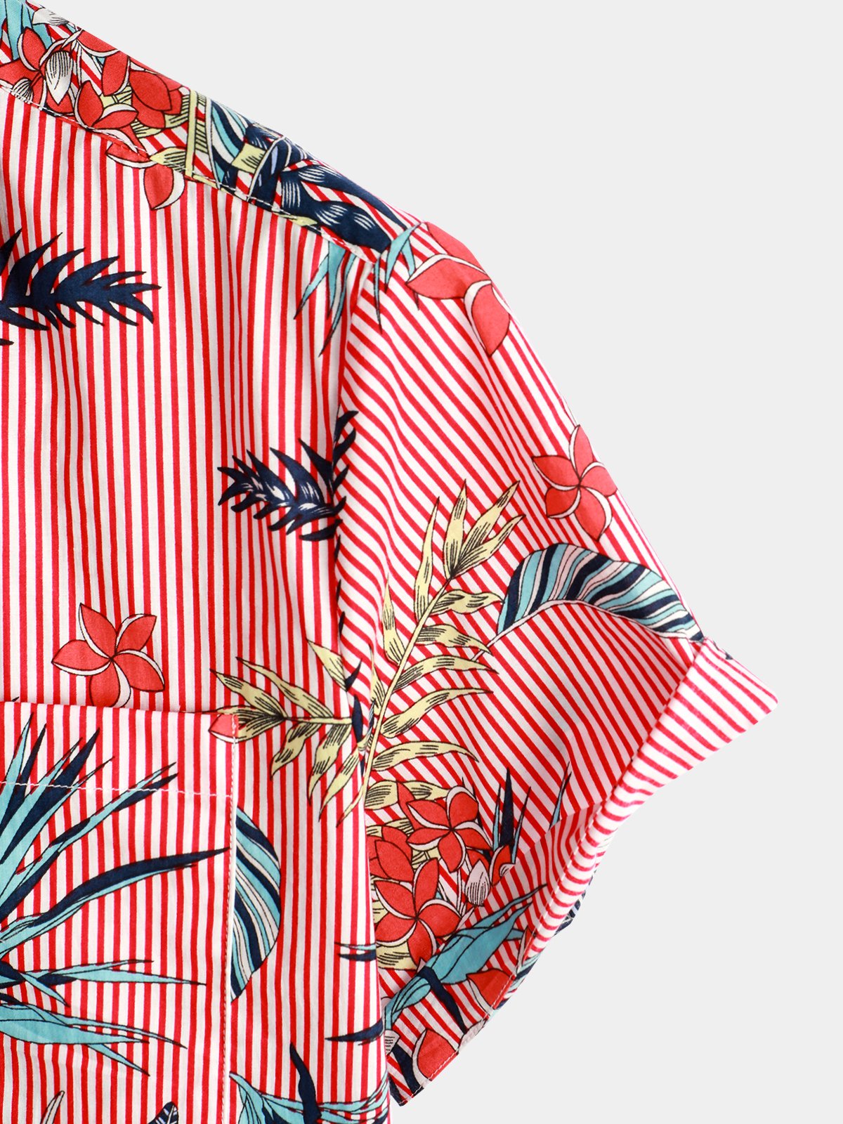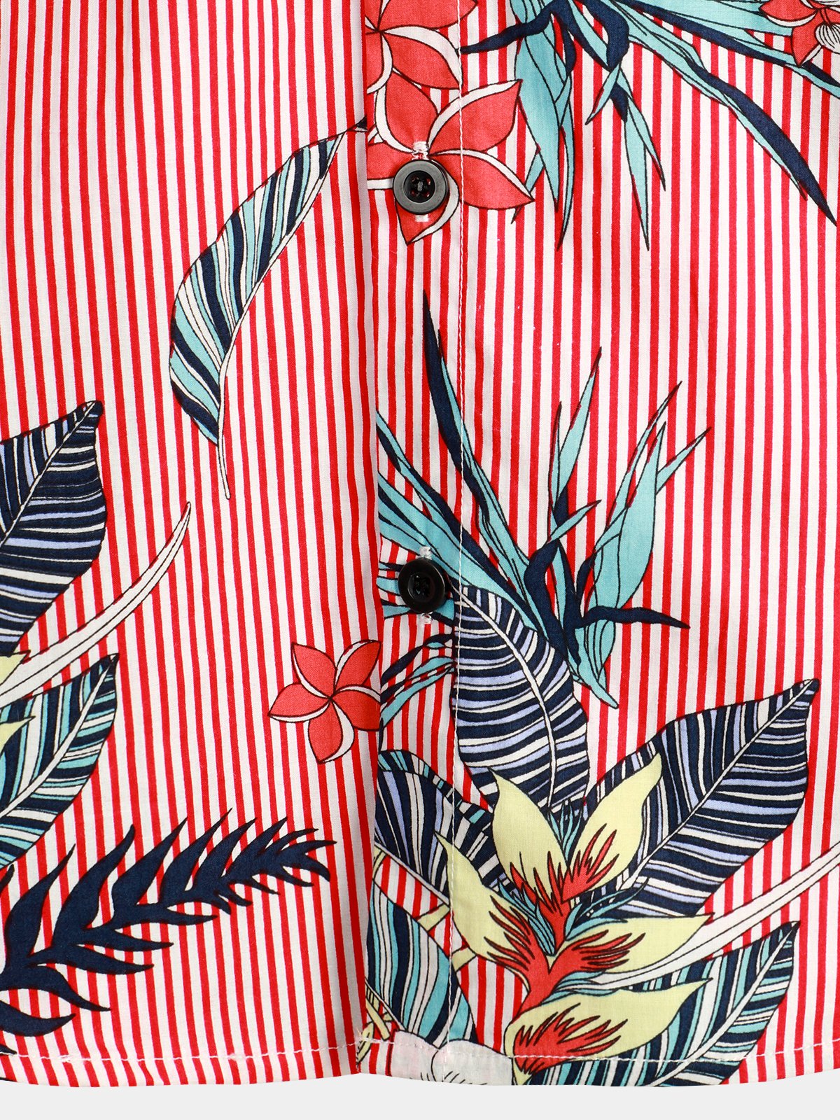 Men's Casual Floral Pocket Cotton Striped Pink Shirt
