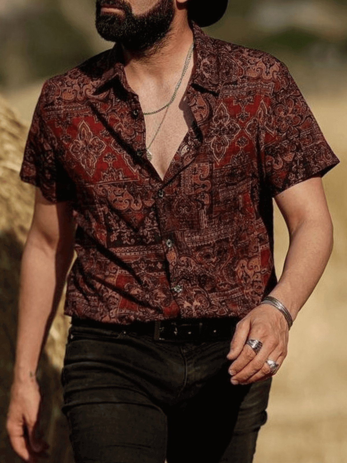 Men's Retro Paisley Floral Print Cotton Button Up Vintage Holiday Western Brown Short Sleeve Shirt