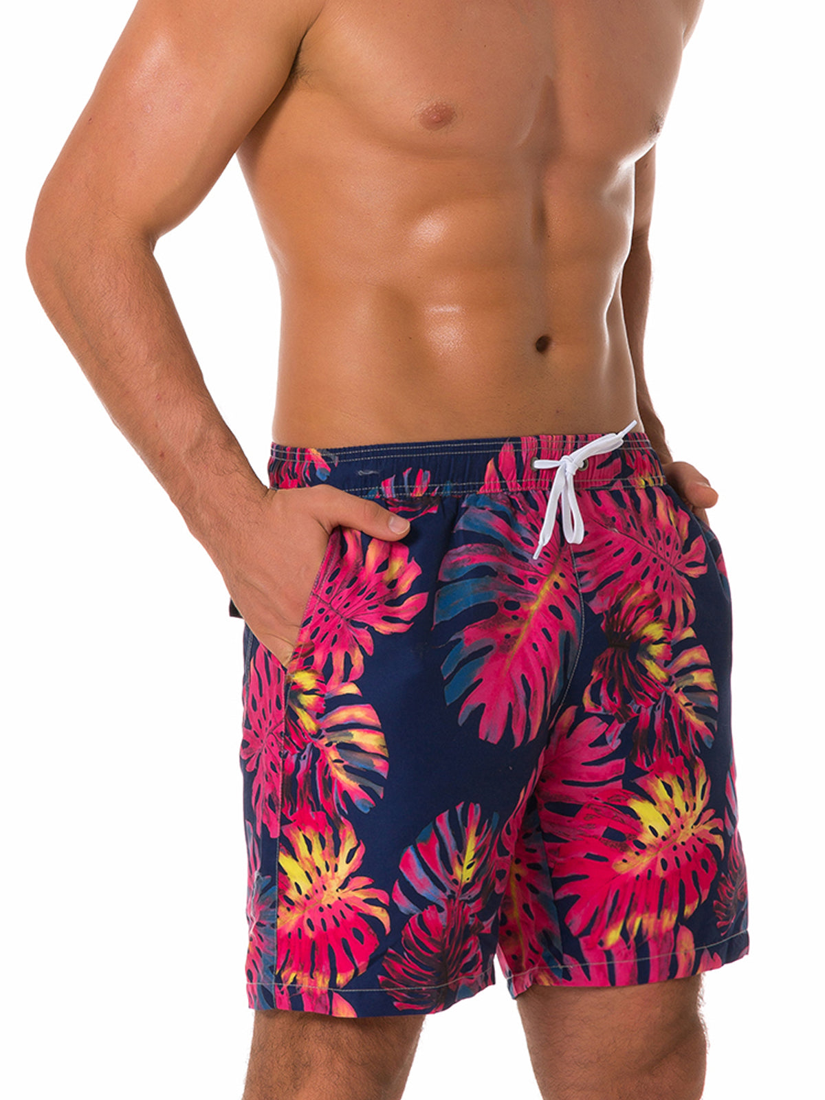 Men's Summer Tropical Leaf Print Beach Shorts Navy Blue Swimming Trunks