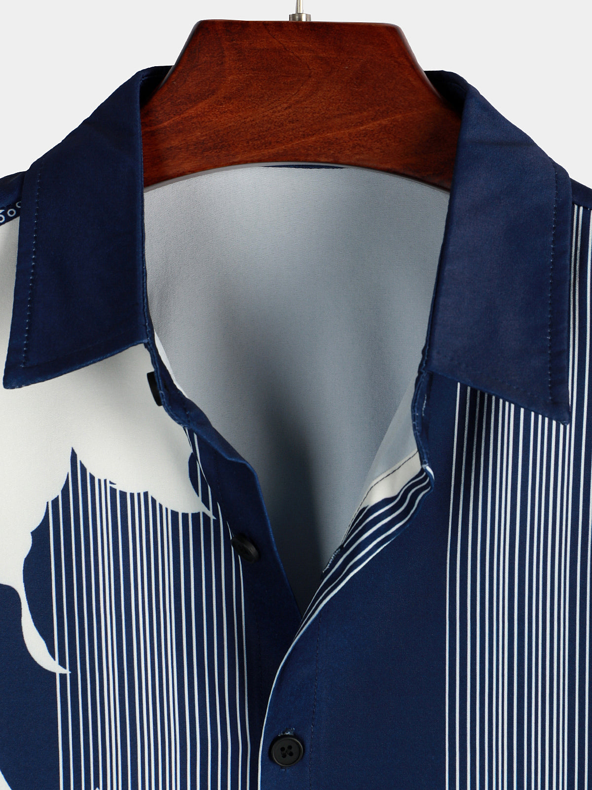 Men's Vertical Stripe Flower Print Vacation Navy Blue Hawaiian Vintage Aloha Short Sleeve Shirt